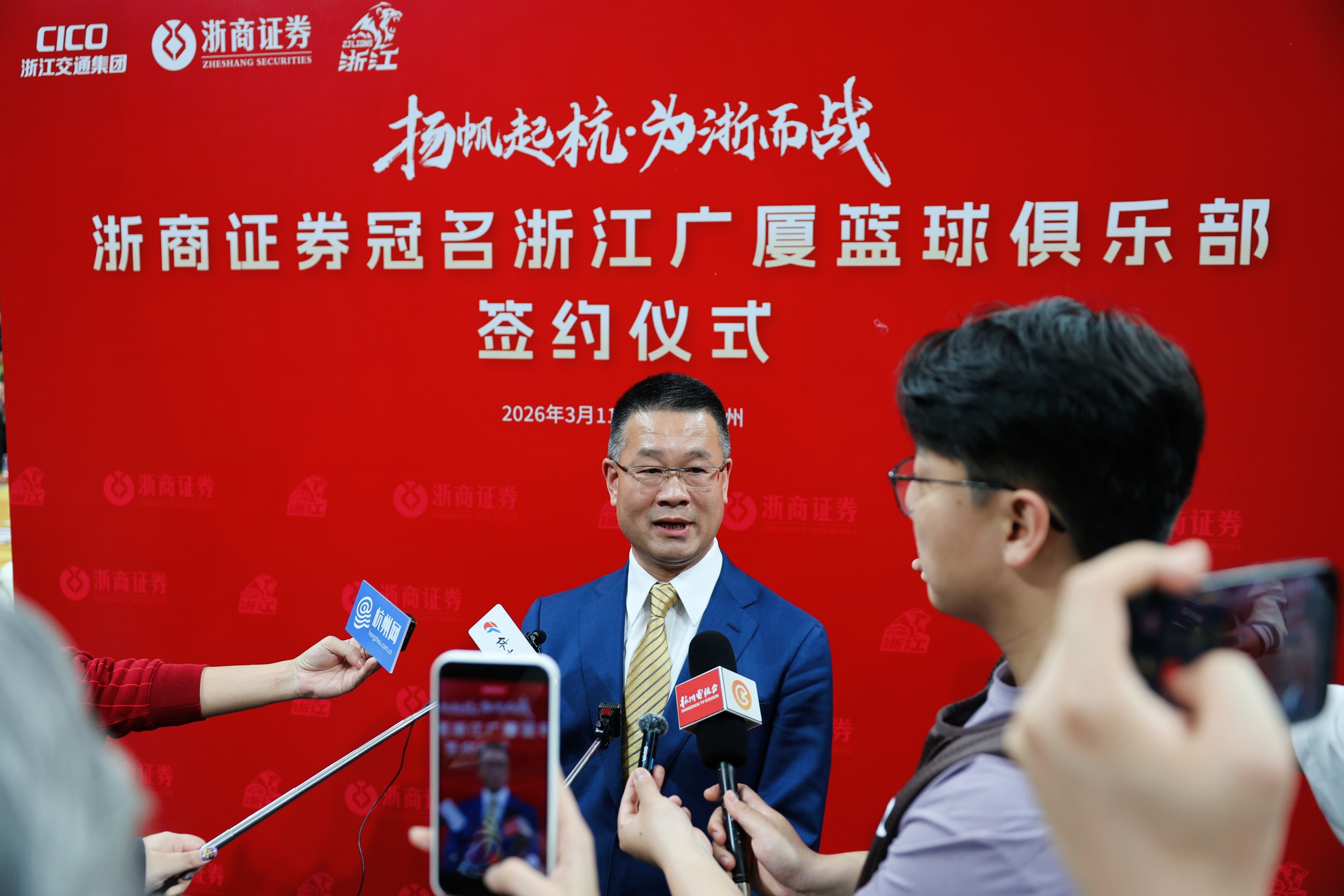 3月11日晚,“扬帆起杭·为浙而战”浙商证券冠名浙江广厦男篮签约仪式在广厦男篮主场杭州黄龙体育馆举行。随着协议的正式签署,浙江广厦男篮将以“浙商证券队”的全新面貌征战CBA联赛,共同开启“金融+体育”跨界融合的全新篇章。四方携手 跨界启航签——浙商证券男篮!cba中国篮球