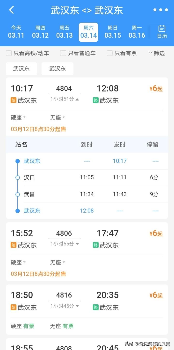 厉害了,从武汉东到武汉东可以做火车啦,主要停靠汉口、武汉这两座车站,而且一天还是4趟火车,票价才6块钱,感觉比地铁还便宜,只是用时比较长,全程要1个小时50分钟了,从这也能看出来武汉有多大了,其实做这趟车游览武汉挺好的,在车上慢慢欣赏武汉的美景,如果不赶时间真的可以体验一下,这也属于便民服务吧,不得不说这个车票真的是很实惠。