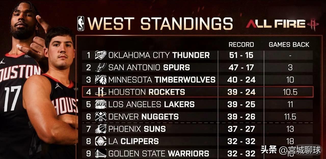 火箭战绩又来到西部第三,明天对阵掘金,如果未能取胜将和森林狼和湖人战绩相同[比心