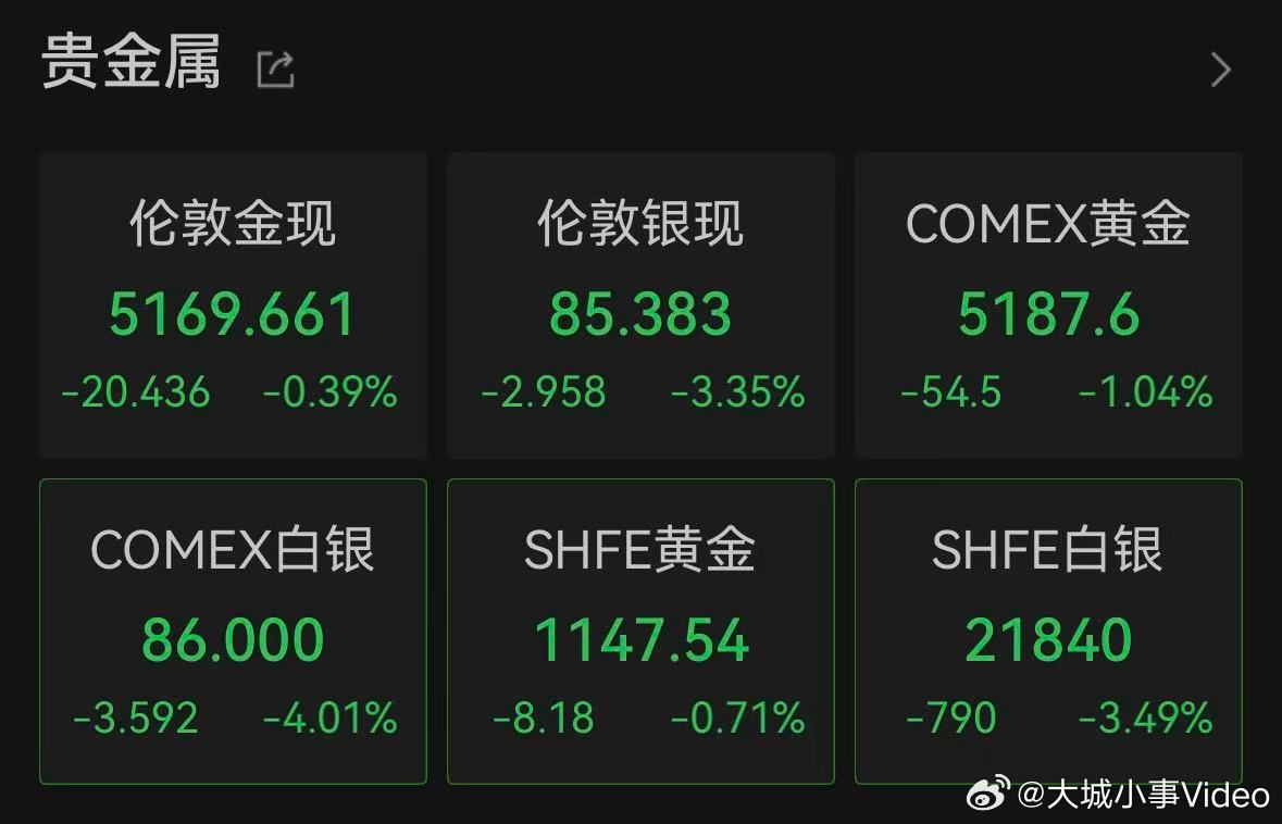 【金银再迎大跌】3月11日晚间,黄金白银价格再度大跌。COMEX黄金大跌1.04%,报5187.6美元/盎司,COMEX白银跌4.01%,报86美元/盎司。白银再迎大跌 哈莫尼黄金跌超10%