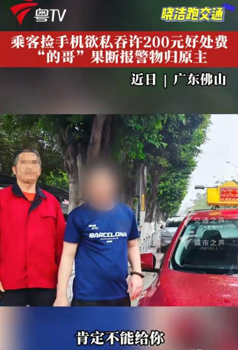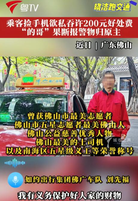 广东佛山,司机刘某接了个女乘客,可她刚一上车电话就不停的响,女乘客一直挂断,刘某越看越不对劲,问了她一个问题,结果竟然炸出了女乘客的秘密!   广东佛山的出租车司机刘先福,有着二十多年的从业经历,还曾获得佛山市最美志愿者、佛山市五星志愿者、最美佛山人、佛山公益慈善优秀人物、佛山最美的士司机以及南海区五星级义工等多项荣誉,日常运营中始终把乘客安全和财物保管放在心上。   事发当天他像往常一样接单,车辆行驶到指定地点后,一名女乘客拉开车门坐进了后排。   女乘客刚落座,她随身携带的物品里就传出持续的手机铃声,声音清晰地传到驾驶座。   刘先福从后视镜里留意到,女乘客没有接起电话,反而反复按下挂断键,铃声刚停没几秒又再次响起,整个过程里女乘客始终没有和刘先福说明任何情况,只是低头摆弄着手里的东西。   这一反常举动让有着多年运营经验的刘先福心生警觉,他没有直接戳破,而是在平稳驾驶的间隙,用平缓的语气向女乘客询问了一个关于物品归属的问题,这个问题直接打破了女乘客的掩饰,让对方藏在心底的秘密暴露了出来。   原来,这部不断响起的手机并非女乘客所有,而是她此前乘坐其他交通工具时,在座位上捡到的。手机主人发现遗失后,不断拨打自己的号码试图联系捡拾者,而女乘客捡到手机后心生贪念,想要将手机占为己有,所以才会一次次挂断来电。   在刘先福的追问下,女乘客承认了自己捡拾他人手机却不愿归还的行为,甚至还提出可以给刘先福 200 元好处费,要求他帮忙隐瞒此事,不要将手机交还给失主。   面对女乘客的利诱,刘先福没有丝毫动摇。他清楚记得自己多年来参与公益服务时学到的准则,也始终牢记作为出租车司机的责任,知道保护乘客财物、维护社会公正是自己的义务。   他没有理会女乘客的好处费提议,而是在确保行车安全的前提下,第一时间选择了报警,向警方说明情况并提交了相关线索。   警方接到报警后迅速出警,赶到现场后对女乘客进行了询问,核实了手机捡拾的完整经过,随后联系上了焦急万分的失主。   失主赶到现场后,确认了手机的归属,这部手机里存着重要的工作资料和个人信息,遗失后一直处于焦虑状态,看到手机被完好找回时,失主对刘先福的正直行为连连道谢。   在警方的调解下,女乘客认识到了自己的错误,主动向失主道歉,将手机完整归还,也放弃了占为己有的想法。整个事件在警方的介入下得到了妥善解决,失主的财物失而复得,刘先福也用实际行动践行了自己的责任与担当。   这件事在网络上传播后,引发了大量网友的关注和讨论。   有网友留言说,拾金不昧是基本的道德底线,刘师傅的做法给所有人做了好榜样。   也有网友表示,面对诱惑还能坚守原则,正是这样的普通人撑起了社会的正气。   还有网友提到,贪图小利最终只会让自己陷入尴尬的境地,做人还是要守住本心。   这件事也给大家提了醒,捡到他人财物时,及时归还才是正确的选择,一时的贪念不仅会违背道德,还可能触犯法律。同时也让大家看到,平凡岗位上的普通人,也能用自己的正直和担当,传递出温暖的社会正能量。   你对这件事有什么看法?欢迎在评论区留言分享你的观点。