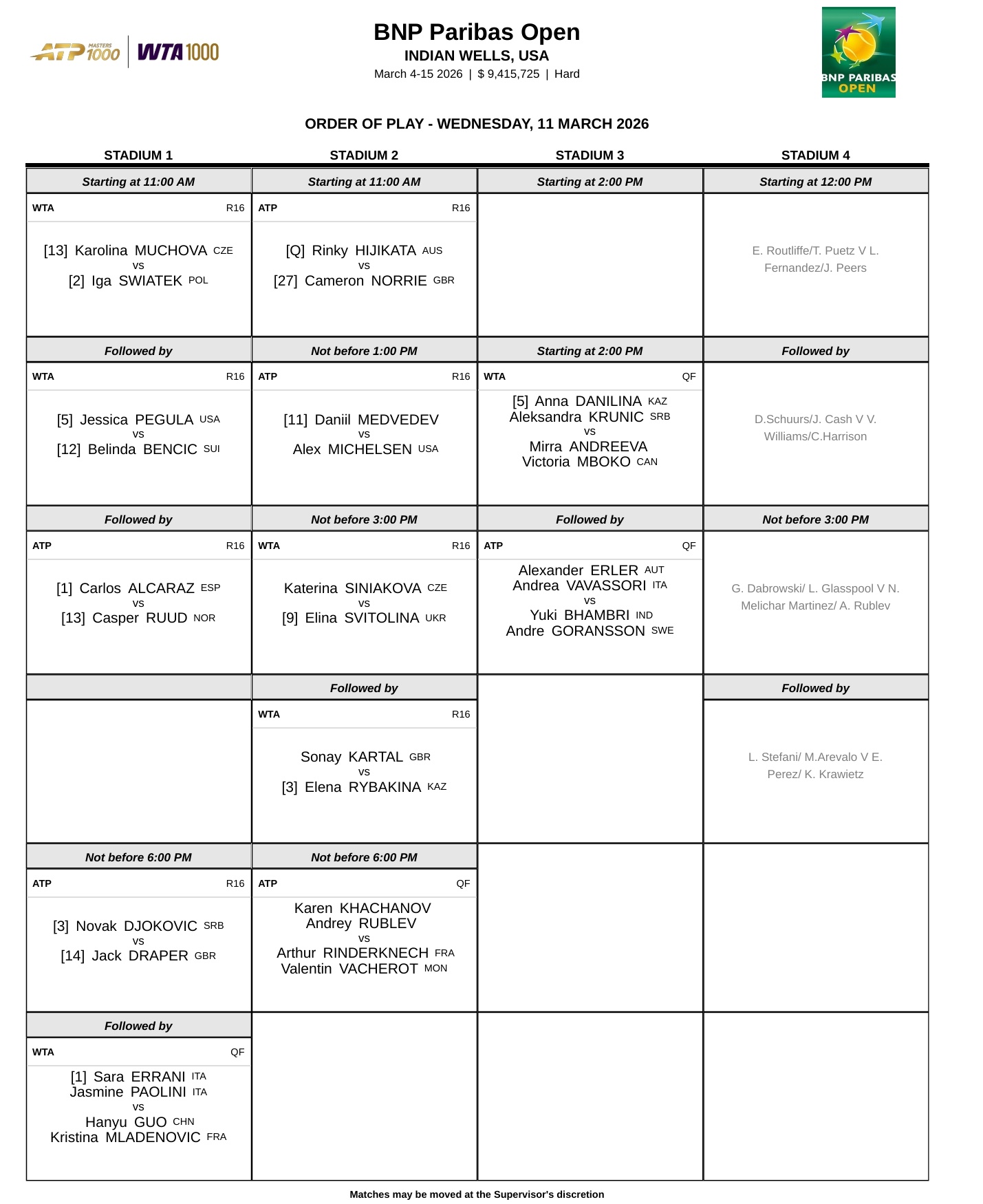 WTA1000印第安维尔斯站第八日赛程📅