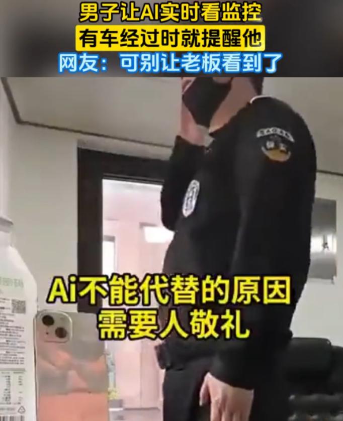 这也太聪明了!一名保安在保安亭里查看大门车辆进出的情况,突发奇想,用AI实时来观测监控,自己则在一旁摸鱼玩手机,有车进来,AI喊一声,他再起身开个门、敬个礼,活一点没耽误,摸鱼摸得明明白白,网友:可别让老板看到了。 视频里的场景,就是我们平时常见的社区门岗,一个不到十平米的玻璃岗亭,里面放着监控屏幕,泛着冷冷的灰光,还有一把破旧的转椅,保安大哥平时就坐在里面,负责查看大门车辆进出,开门放行、敬礼致意,看似简单的工作,其实特别熬人。 大家都知道,保安看监控是个费神的活儿,得一整天死盯着屏幕,不能有半点走神,生怕漏看一辆车、没卡好门禁,要是出了点差错,轻则被老板责骂,重则还要扣工资,长时间盯着毫无波澜的黑白监控画面,眼睛容易酸胀,精神也会涣散,那种无意义的等待,就像慢火一样煎熬着人,换谁都得觉得枯燥。 可这位保安大哥,却想出了一个好办法,彻底解放了自己。他找了一部磨损的旧手机,用塑料支架架在岗亭里,镜头正对准监控屏幕,还下载了免费的AI插件,设置了车辆检测提醒,把这部改装后的旧手机,变成了岗亭里真正的“哨兵”。 原来大哥平时刷手机的时候,偶然看到一款家用监控软件,能用AI算法识别乱窜的野猫,他突然来了灵感,既然AI能看清小猫的动静,那肯定也能识别出慢悠悠驶过的汽车,说干就干他没花一分钱,利用闲暇时间,简单设置了一下,就完成了这场“小改造”,用技术省了自己的力。 从那以后大哥的工作就轻松多了。他不再需要死死盯着监控屏幕,而是窝在转椅里,安心刷着短视频,双手彻底从枯燥的监控中解放出来,只要有车辆驶入监控范围,手机里的AI算法就会瞬间触发,发出冷冷的机械提示音,有车来了。 这一声提示音一响起,原本还懒洋洋窝在椅子里的大哥,立马精神起来,膝盖猛地发力弹起,右手迅速按下道闸按钮,左臂还会以标准姿势抬到眉侧,完成一次教科书级别的敬礼,动作流畅又标准,一点都不敷衍,等车辆驶过后,他又立刻瘫回转椅,熟练地切回手机屏幕,继续刷视频,一切都衔接得恰到好处。 就这样大哥既没漏过一辆车,也没少过一次敬礼,工作完成得滴水不漏,老板就算查岗,也挑不出半点毛病,可他自己却轻松了不少,不用再熬着神盯监控,摸鱼摸得明明白白,不得不说这脑子是真的灵光。 这段视频无意中流出后,很快就在网上火了起来,网友们纷纷留言调侃,有人说“这大哥也太会了,把摸鱼和干活平衡得恰到好处”,还有人笑着提醒“可别让老板看到了,不然这聪明劲儿,怕是要被针对”,也有网友佩服地说“这才是真正的摸鱼高手,活干好自己也舒服”。 当然也有一些不同的声音,有人觉得大哥这是上班偷懒,用AI代替自己工作,是对工作的不尊重,可仔细想想,大哥并没有耽误任何工作,开门、敬礼,每一项都做得很到位,他只是用更聪明的方式,减少了不必要的内耗,摆脱了那种吞噬精神的枯燥,反而提高了工作效率。 其实这份工作的本质,就是看好大门、放行车辆,大哥用AI帮自己盯监控,并没有违反工作规定,也没有影响工作质量,反而让自己从无意义的煎熬中解脱出来,说到底他不是偷懒,而是太懂这份工作的本质,用简单的技术,优化了自己的工作流程。 最有意思的是,直到现在也没看到大哥被开除的消息,管理层一直保持沉默,或许他们也明白,留一个会用技术优化工作、把活儿干得漂亮的员工,比留一个只会呆呆盯着监控、精神涣散的员工,要明智得多,网友们的调侃,与其说是担心大哥丢工作,不如说是羡慕他这份聪明,羡慕他能在枯燥的工作中,为自己找一条轻松的出路。