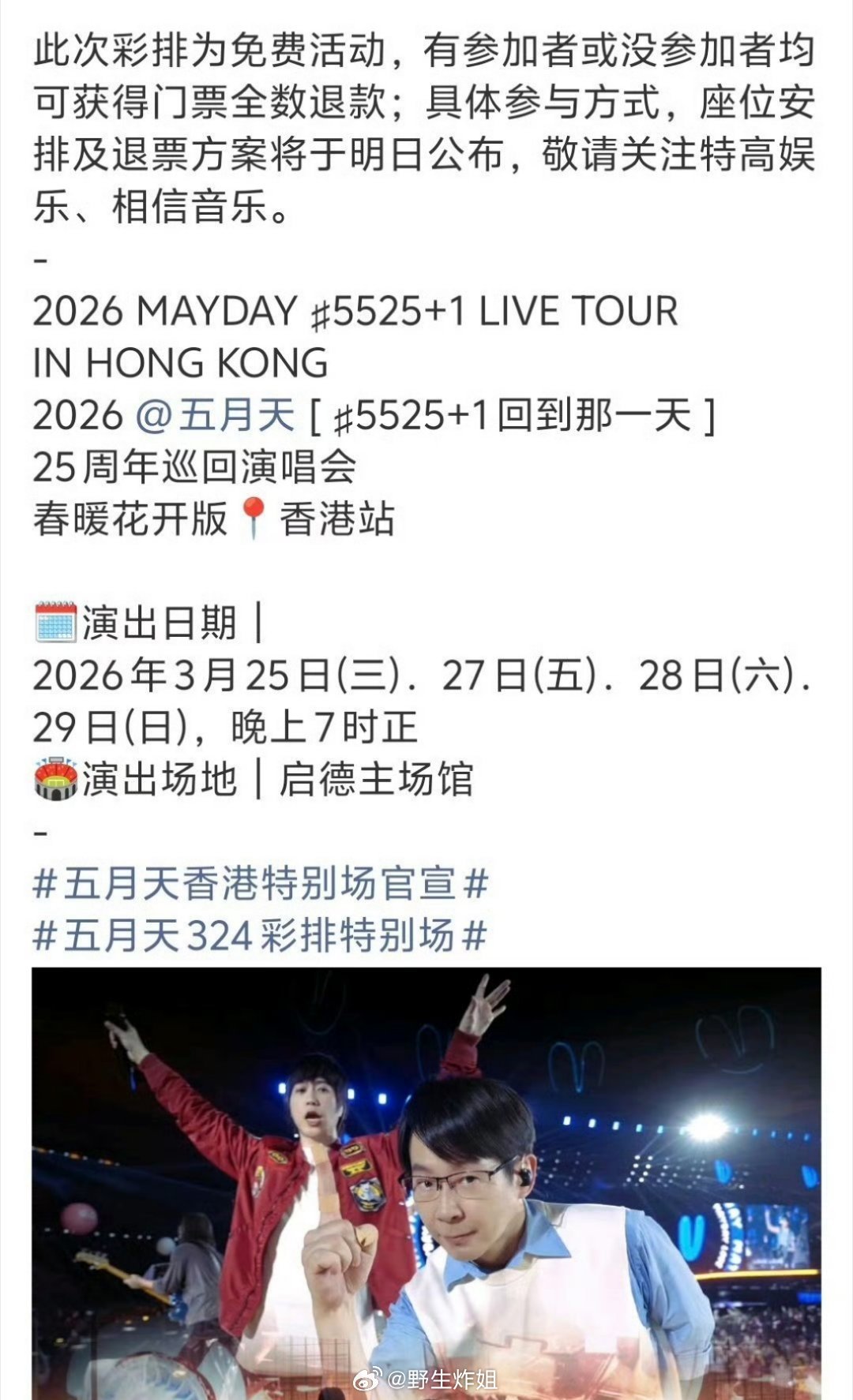五月天之前说取消了3月24日的演出,现在出来说原来当天会有一场特别演出啊,是免费