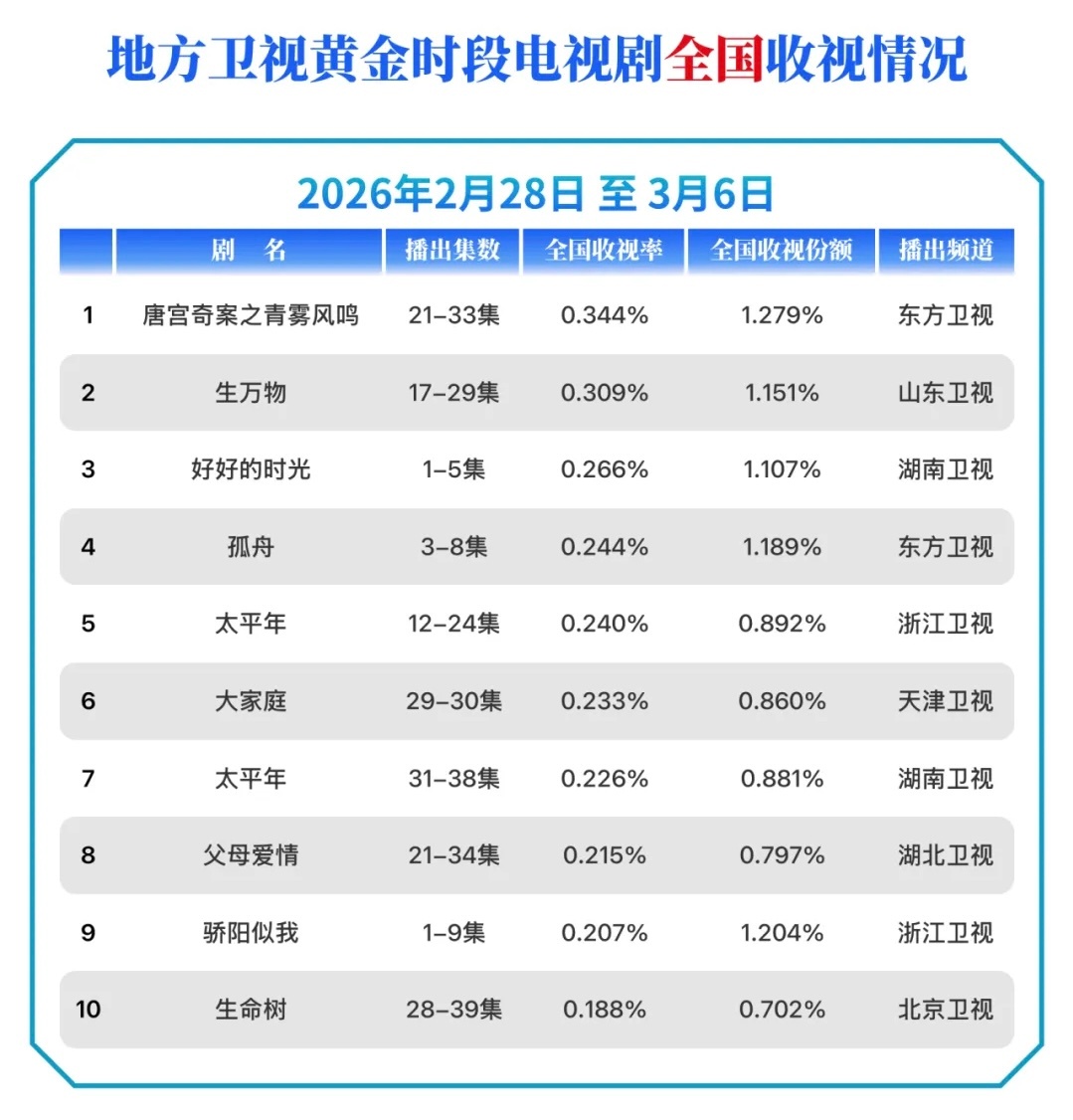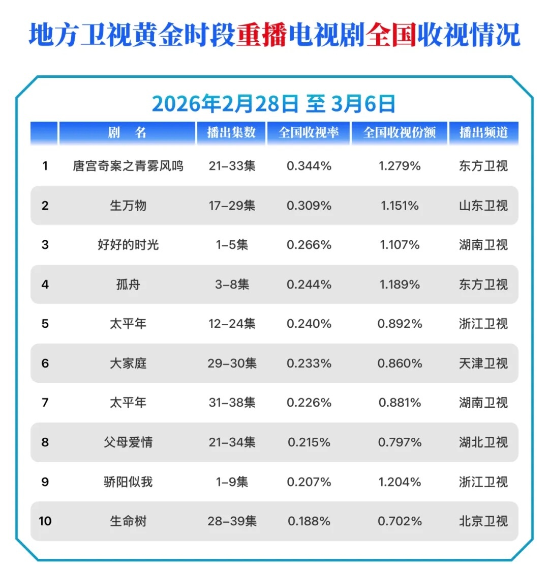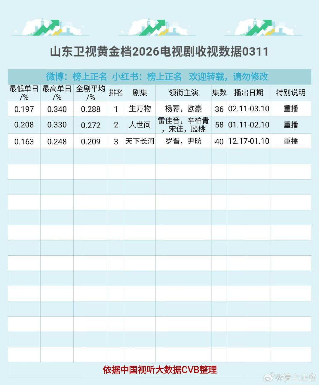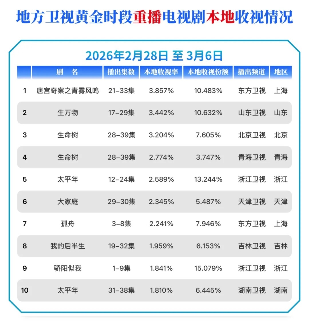 2.28—3.6 cvb收视率排行榜杨幂主演《生万物》 第13轮山东卫视重播收视相比上周再创新高!👏地方卫视黄金时段:电视剧全国收视排名Top2重播电视剧全国收视排名Top2重播电视剧本地收视排名Top2