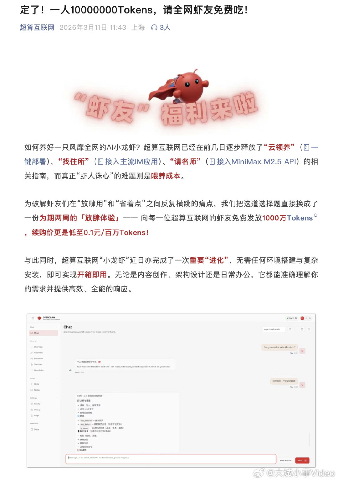 【每人1000万!超算互联网免费发放Tokens】OpenClaw的Token续购价格 3月11日,国家超算互联网宣布面向平台的全体OpenClaw用户,免费发放每人限时2周总计1000万Tokens额度。同日,超算互联网还公布了OpenClaw的Token续购价格:0.1元/百万Tokens,较市场均价有一定降幅。 (财联社)