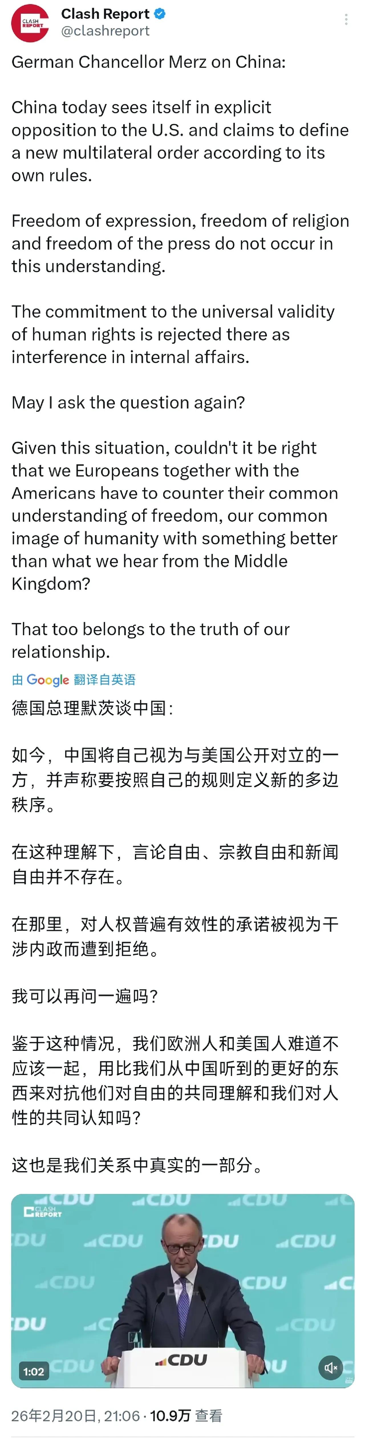 【德国的表现就像是美国的附庸】 英国《泰晤士报》昨天(3月11日报道,针对特朗普威胁切断与西班牙的贸易往来,而坐在一旁的德国总理默茨非但没有帮西班牙说话,反而批评西班牙未按照要求增加军费,彻底激怒了西班牙政府。该国官员称,坚决反对美以对伊朗的军事行动,并指责默茨背叛了德国执政党的“价值观〞,在特朗普面前的表现“就像是美国的附庸”。 德国并非像是美国的附庸,本来就是美国的附庸,而且自己也承认是美国的附庸。上月初德国外长瓦德富尔在新加坡一脸认真地表示,德国将永远跟随美国,哪怕柏林如何被美国所虐,我们也决不转投中国。德国总理访华前在抹黑中国的同时,表示德国将坚定的做美国的附庸,还呼吁其他欧洲国家做美国的附庸(图4)。德国视中国的发展为威胁,而将美国的胁迫视为“正常关系”、“可靠伙伴”,对此中美两国早已得出同一结论:德国选择做美国的附庸而非自主。