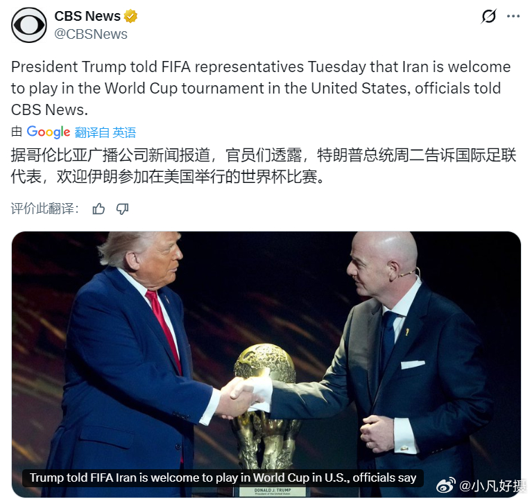 据哥伦比亚广播公司新闻报道,官员们透露,特朗普周二告诉国际足联代表,欢迎伊朗参加在美国举行的世界杯比赛。伊朗称毁灭性打击美军基地特朗普说对伊行动即将结束海外新鲜事黄媒不会说的真相