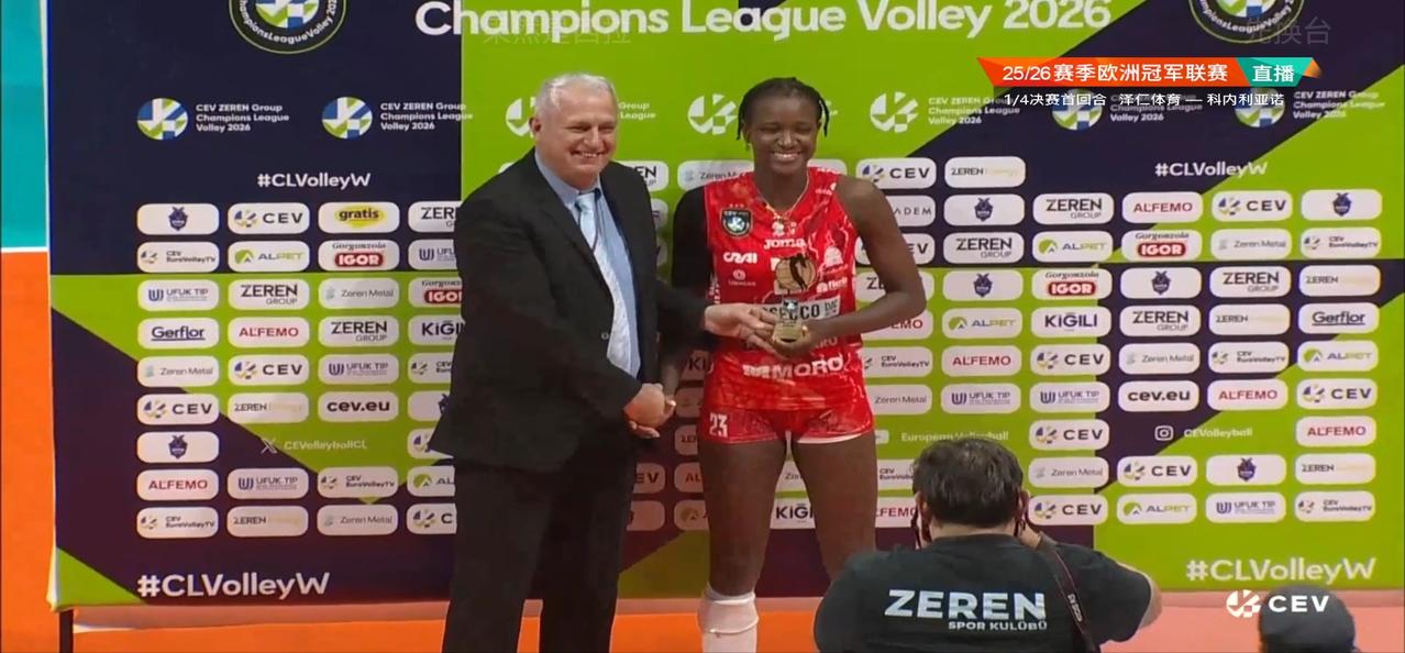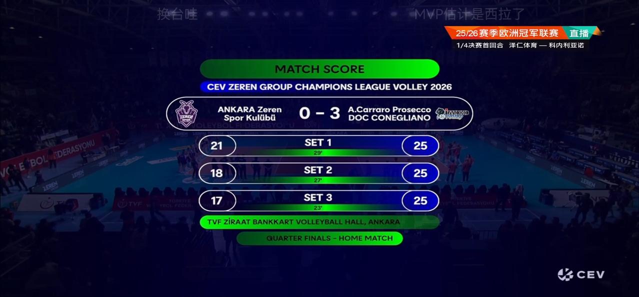 在今天凌晨结束的25/26赛季欧冠1/4决赛首回合的一场比赛中,朱婷效力的科内利亚诺客场对阵土耳其泽仁体育,在预赛中,科内曾双杀泽仁体育,在实力和心理上占优,本场比赛科内首发派出了除加比外的全部主力,加比看来还是伤病没有全好,穿上了自由人的服装,替补主攻西拉再次获得首发的机会,这场比赛科内打得虽然不够顺畅,但毕竟实力强大,在拦网上给对方很大的压力,而泽仁体育每一局都是只能打好前半局,后半局就出现各种无畏的失误直接崩盘,最后科内以3:0(25:21、25:18、25:17)战胜对手获得先机,双方第二回合的比赛将在3月19号3:30进行。本场比赛替补主攻西拉发挥在线没有拖后腿,获本场MVP,朱婷本场在拦网上也有不错表现,全场拿下16分。