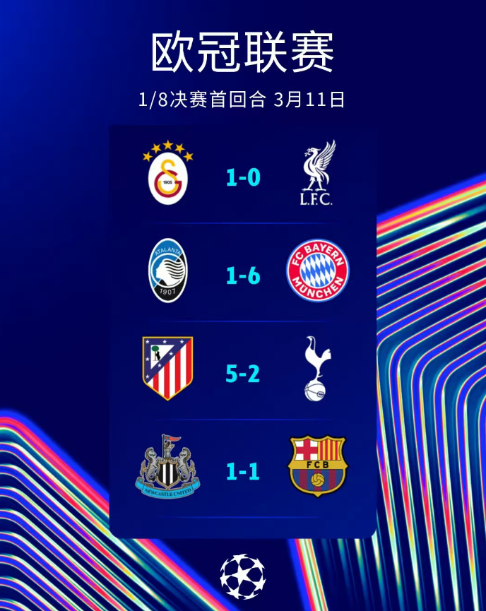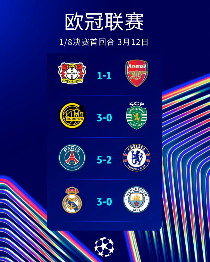 至此首回合的角逐全部结束,英超六支球队纷纷不胜,而西甲三队保持不败战绩,拜仁、马竞、大巴黎、皇马和博德闪耀距离晋级八强近在咫尺。