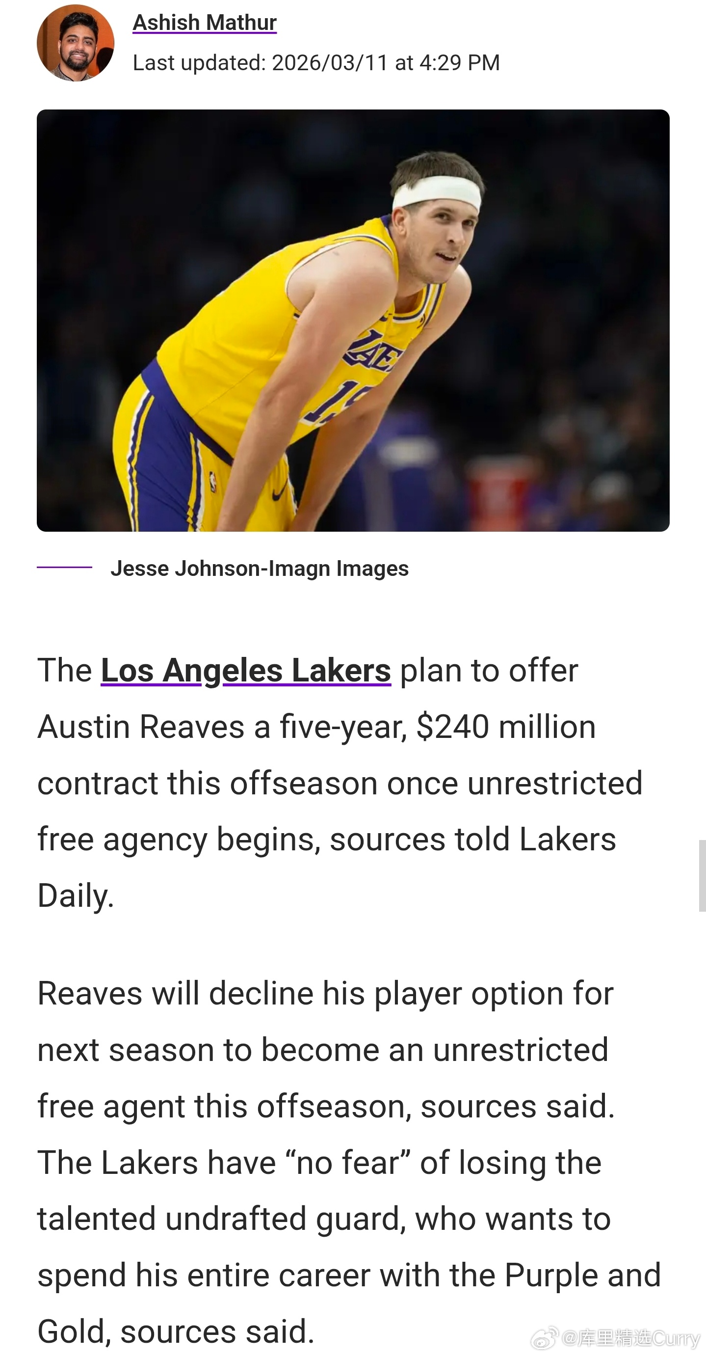 Ashish Mathur:湖人计划休赛期5年2.4亿美元续约奥斯汀·里夫斯,多名湖人球员已准备好迎来詹姆斯湖人时代的结束。