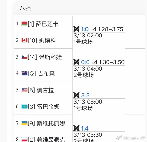 会不会有黑马呢?印第安维尔斯1000赛 女单八强出炉看好谁拿走巨款巨分