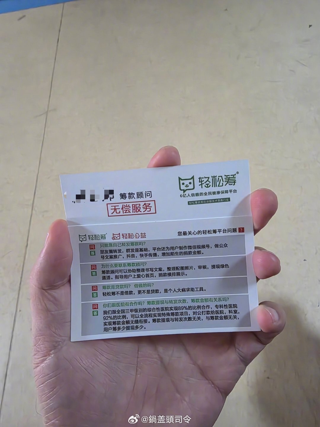 轻松筹在医院里发卡片,说可以免费给筹款,无偿服务。我搜了一下,手续费提现费是有的,也不低。但这玩意也确实能给一些患者提供便利。