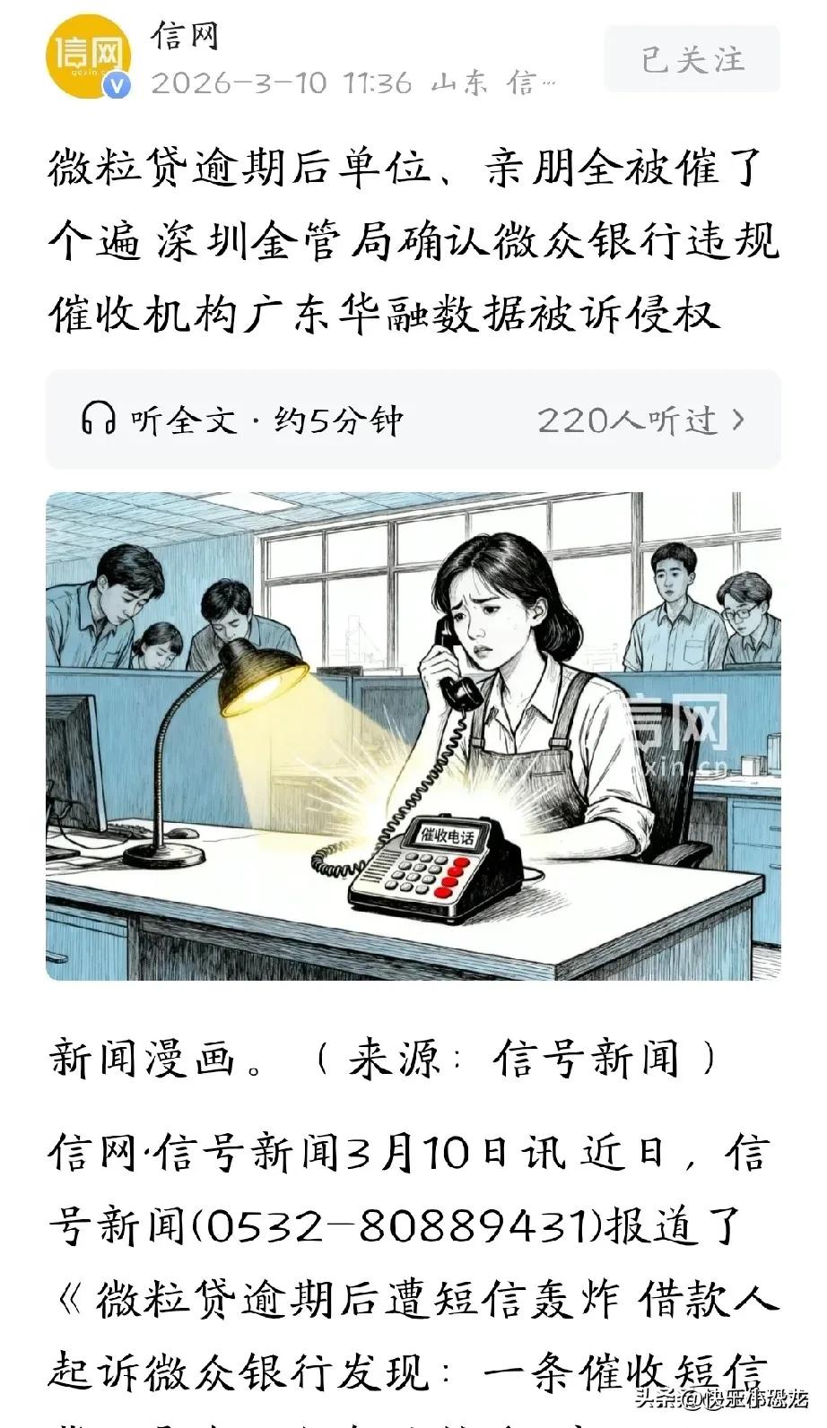 太心酸了!广东深圳一位女子,只因临时急用钱,先后在微粒贷借了4万元和2.5万元。想着周转后按时还款,后来出现了突发状况,没能按时结清,竟遭遇平台疯狂催收,一天十几条短信。更让她崩溃的是,单位同事、亲朋好友也全被平台联系了个遍,工作生活的节奏都乱了。 女子家里的老人突发重病住院,手术费和住院费一下子掏空了她所有积蓄,走投无路之下才打开微粒贷应急,前后分两次借了六万五,心里想着等发了年终奖再慢慢还上。 可天不遂人愿,老人术后恢复情况不好,后续的康复治疗又是一笔不小的开支,她的工资全贴进了医院,根本抽不出钱还网贷,还款日期一拖再拖,逾期的第一天起,催收就没停过。 刚开始只是短信提醒,她没太在意,想着等够钱就还,可没过几天,催收短信就变成了轰炸模式,早上七点、中午午休、晚上十一二点,不分时间段地发,内容也从提醒变成了威胁,说要起诉、要上报征信、要冻结账户。 她手机整天响个不停,上班时不敢开声音,只能调成静音,可一拿手机就是满屏的未读消息,心慌得根本没法专心工作。 更过分的是,平台不知道从哪获取了她的通讯录,开始挨个联系她的同事和亲友。同事在办公室私下议论她欠钱不还,领导也找她谈话,怀疑她的财务状况影响工作。 亲戚朋友要么打电话来质问,要么躲着她,生怕她开口借钱。原本和睦的人际关系变得一团糟,她走到哪都觉得别人在背后指指点点,那段时间她整夜失眠,情绪低落到极点,甚至不敢出门见人。 她也试着主动联系平台客服,说明自己的难处,拿出老人的住院证明,请求延期还款或者分期处理,可客服态度强硬,根本不听她的解释,只一味催促还款。 还说联系通讯录是正常的催收手段,让她尽快还钱就不会再骚扰。走投无路之下,她才下定决心收集所有催收短信和通话记录,把平台告上了法庭,想要讨个说法。 其实网贷逾期催收早就成了社会痛点,很多平台打着合规的旗号,做着暴力催收的事,泄露用户通讯录、骚扰无关人员,早已触碰了法律红线。 借款人逾期固然有错,但不能成为平台肆意侵犯他人隐私、扰乱他人生活的理由,每个人都有基本的人格尊严和生活安宁,不该因为一次资金困难就被全盘否定。 我始终觉得,借贷双方都该守好底线,借款人要量力而行、信守承诺,平台更该合法经营、文明催收,不能为了追回欠款就不择手段。 法律保护债权人的权益,也同样保护债务人的合法权益,暴力催收从来都不是解决问题的方式,只会把人逼上绝路。 在这件事里,女子的困境值得同情,平台的过激行为更该被追责。当金钱借贷变成了隐私侵犯与精神折磨,当逾期还款变成了社会性羞辱,这就不是简单的债务纠纷了。 我们期待的,是每一个陷入困境的人被公平对待,而不是被推向深渊。 各位读者你们怎么看?欢迎在评论区讨论。