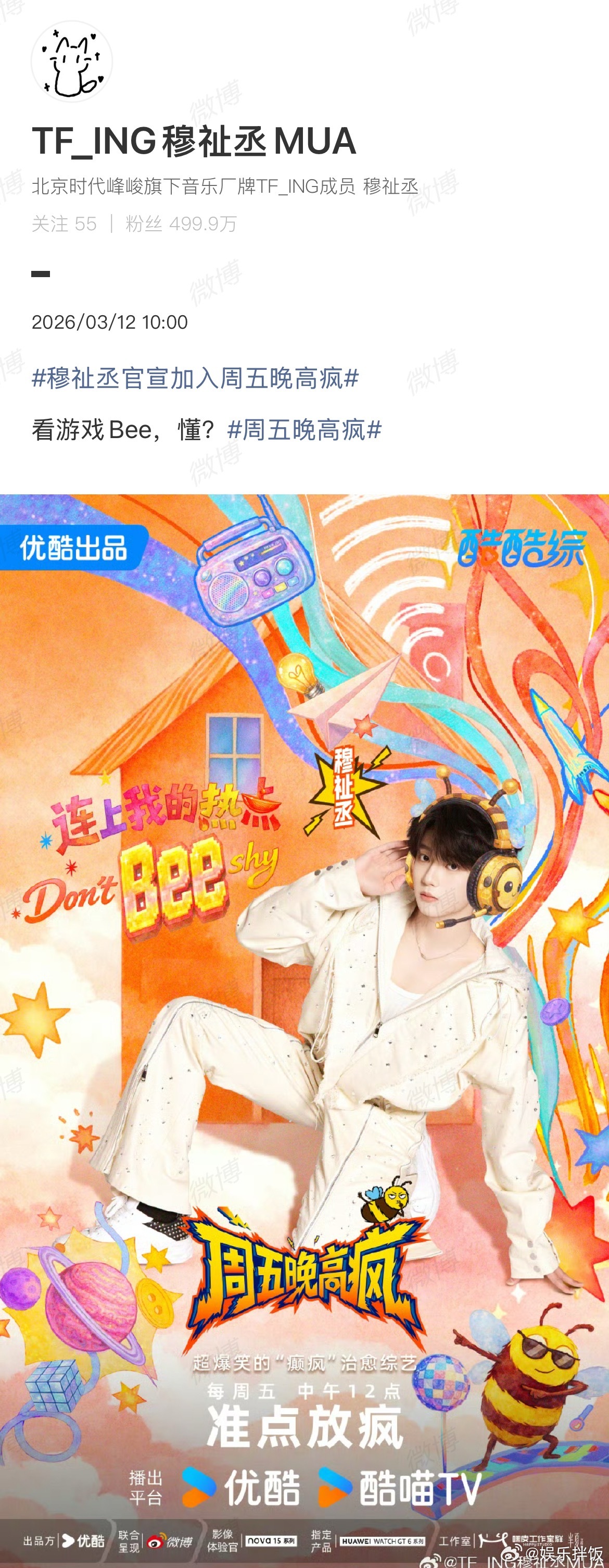 穆祉丞蜜蜂耳机 穆祉丞《周五晚高疯》官宣加盟海报 ,穆祉丞第一个常驻综艺玩的很开心期待穆祉丞更多综艺 穆祉丞第一个常驻综艺