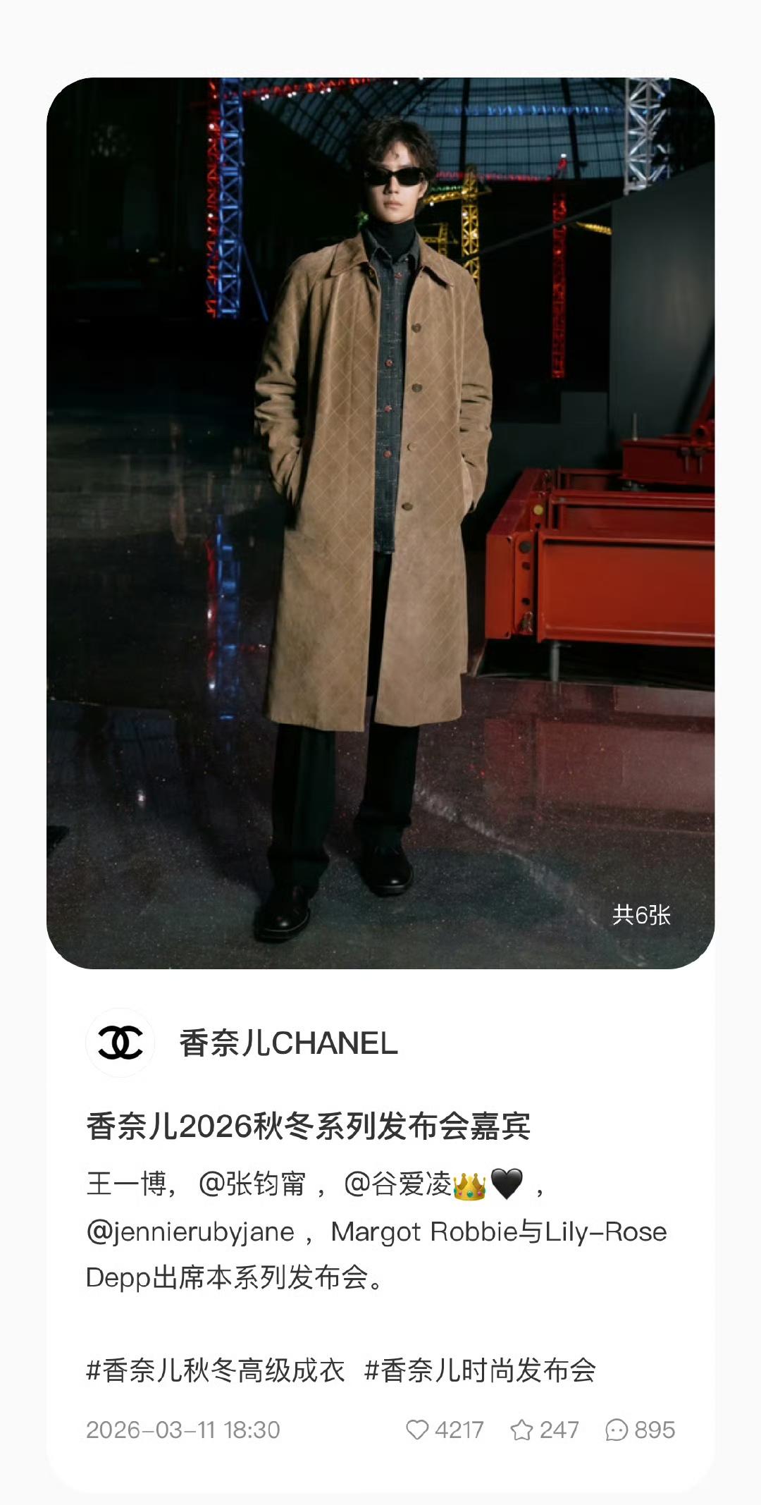 王一博发博说“香奈儿2026秋冬系列发布会给我带来了不一样的感受。我看到了更多会