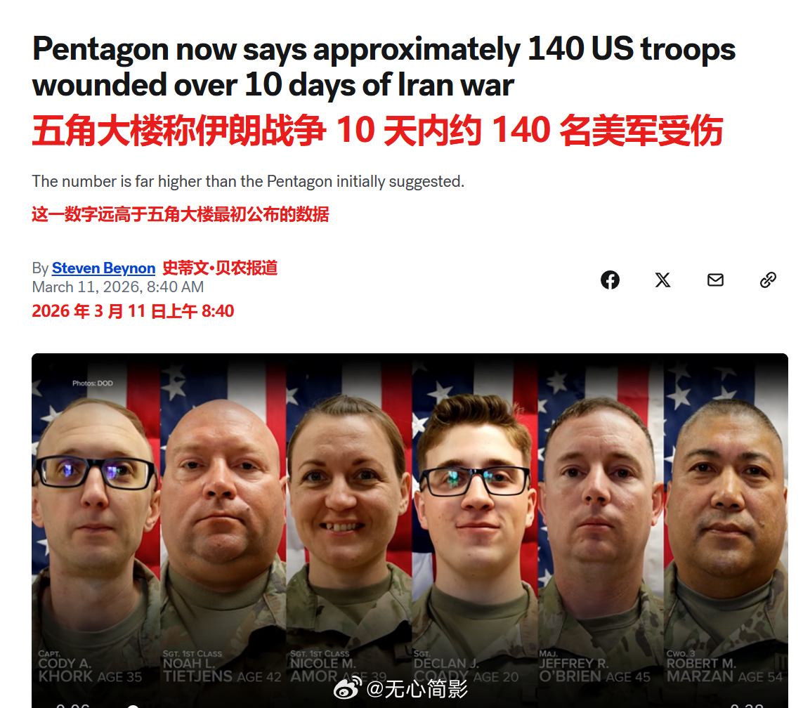 美国五角大楼周二承认,在美伊战争中受伤的美军人数远高于其最初公布的数字,这一做法打破了长期以来关于战斗伤亡的透明度惯例。ABC报道称,五角大楼长期以来一直将公开披露伤亡数字(包括在战斗中受伤的士兵)视为其对美国公众和服役人员家属负责的核心部分——这一做法可追溯到第二次世界大战。自本次冲突爆发以来,五角大楼仅披露了"重伤"人数——根据国防部医疗规定,这类伤势可能危及生命——尽管目前尚不清楚五角大楼在最初披露伤亡情况时如何界定这一标准。但五角大楼发言人肖恩·帕内尔周二承认,自 10 天前战争爆发以来,至少有 140 名军人在伊朗的报复性袭击中受伤,他在一份声明中补充说,"绝大多数伤势轻微"。其中 108 人已重返岗位。这一承认是在美国广播公司新闻网和其他新闻机构就伤亡数字向五角大楼施压后才做出的,因为了解情况的消息人士称,受伤军人的数量似乎远高于其公开披露的数字。帕内尔在声明中说:"仍有八名军人被列为重伤,正在接受最高级别的医疗护理。""史诗狂怒"行动至今已造成七名军人死亡,其中六人在科威特遭伊朗无人机袭击身亡,另有一名士兵在沙特阿拉伯阵亡。国防部长皮特·赫格塞斯多次警告称,预计还将出现更多伤亡。