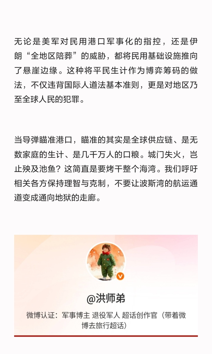 无论是美军对民用港口军事化的指控,还是伊朗“全地区陪葬”的威胁,都将民用基础设施推向了悬崖边缘。这种将平民生计作为博弈筹码的做法,不仅违背国际人道法基本准则,更是对地区乃至全球人民的犯罪。
