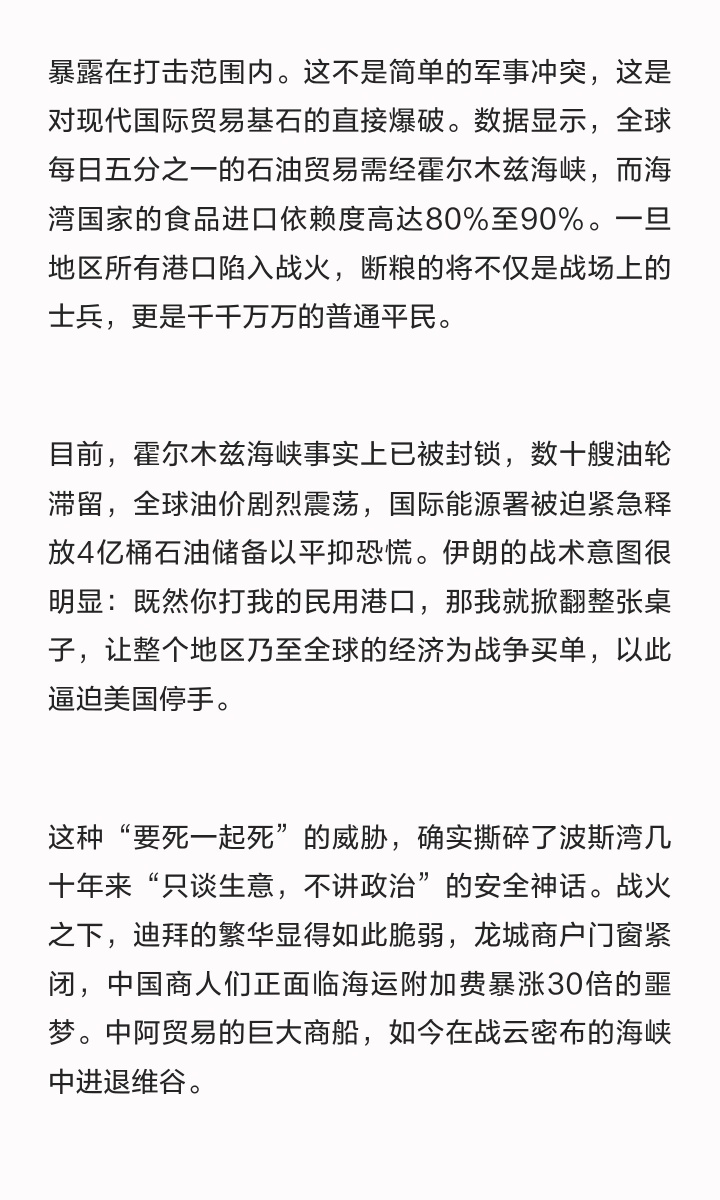 这种“要死一起死”的威胁,确实撕碎了波斯湾几十年来“只谈生意,不讲政治”的安全神话。战火之下,迪拜的繁华显得如此脆弱,龙城商户门窗紧闭,中国商人们正面临海运附加费暴涨30倍的噩梦。中阿贸易的巨大商船,如今在战云密布的海峡中进退维谷。