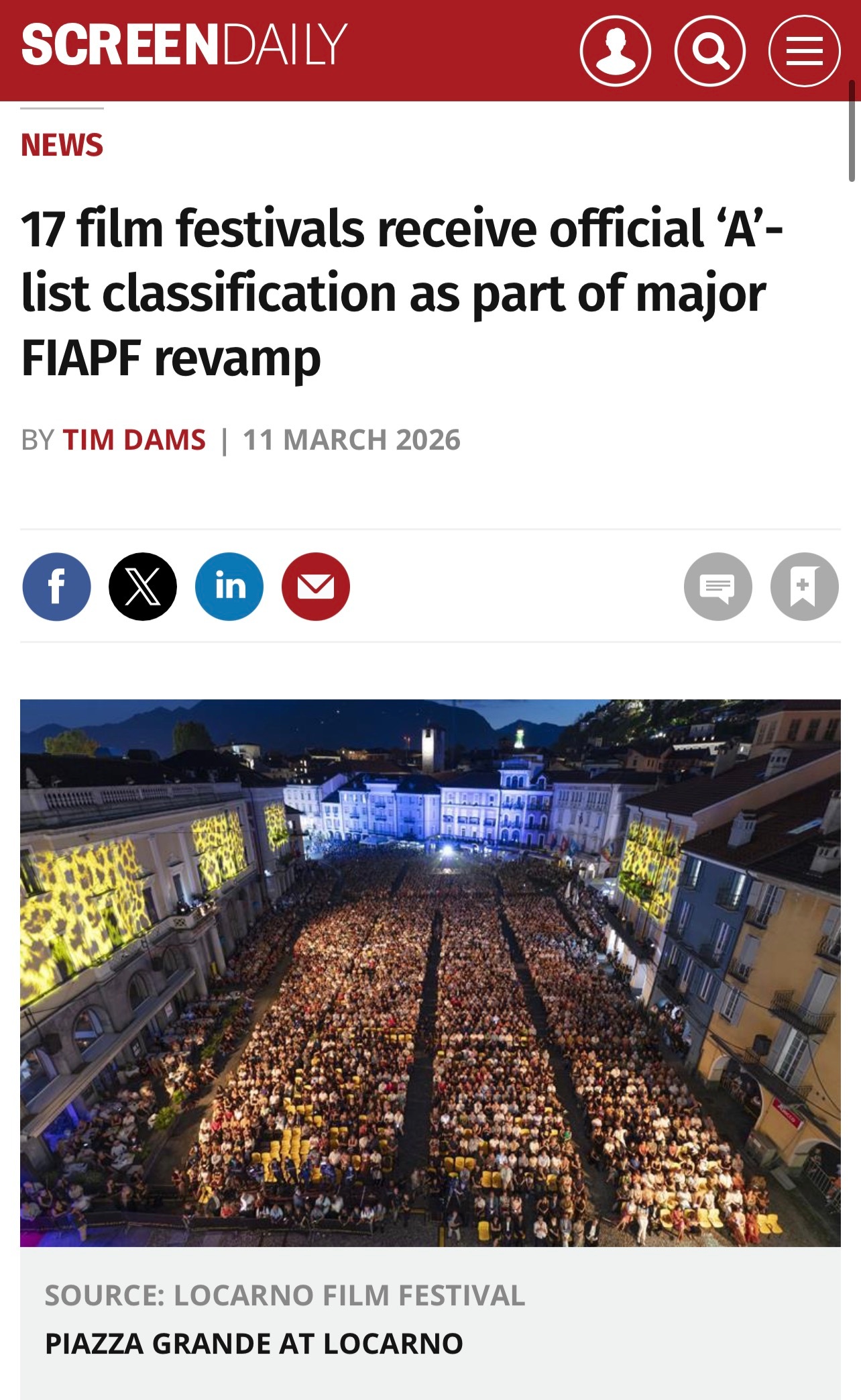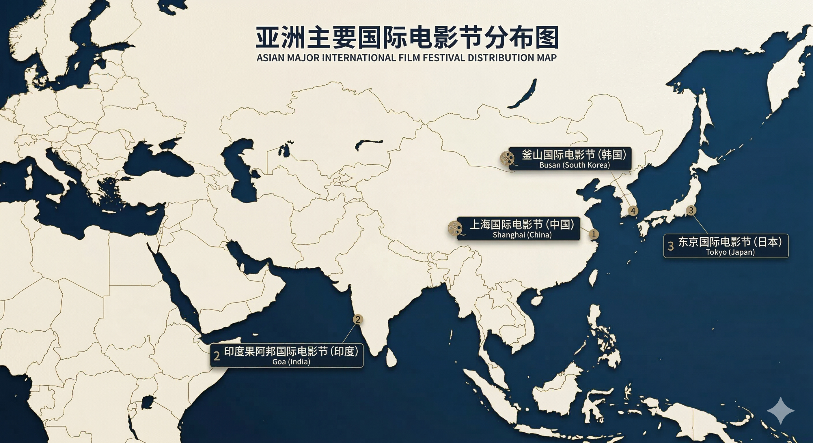 🎞️国际A类电影节定为17个,新增4个欧洲(10个)戛纳国际电影节(法国)威尼斯国际电影节(意大利)柏林国际电影节(德国)洛迦诺国际电影节(瑞士)圣塞巴斯蒂安国际电影节(西班牙)卡罗维发利国际电影节(捷克共和国)塔林黑夜国际电影节(爱沙尼亚)华沙国际电影节(波兰)昂西国际动画电影节(法国,新增)克莱蒙费朗国际短片电影节(法国,新增)亚洲(4个)上海国际电影节(中国)印度果阿邦国际电影节(印度)东京国际电影节(日本)釜山国际电影节(韩国,新增)美洲(2个)马塔布拉塔国际电影节(阿根廷)多伦多国际电影节(加拿大,新增)非洲(1个)开罗国际电影节(埃及)