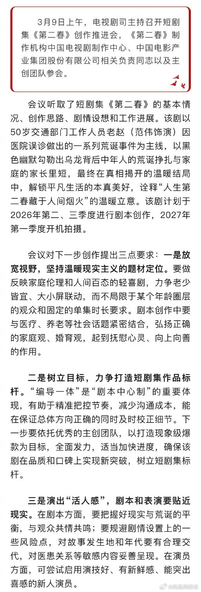 范伟将参演短剧集第二春 3月9日上午,电视剧司主持召开短剧集《第二春》创作推进会,该剧以50岁交通部门工作人员老赵因医院误诊做出的一系列荒诞事件为主线,以黑色幽默勾勒出乌龙背后中年人的荒诞挣扎与家庭的家长里短,诠释“人生第二春藏于人间烟火”的温暖立意。据悉,该剧将由演员主演,计划于2026年第二、三季度进行剧本创作,2027年第一季度开机拍摄。