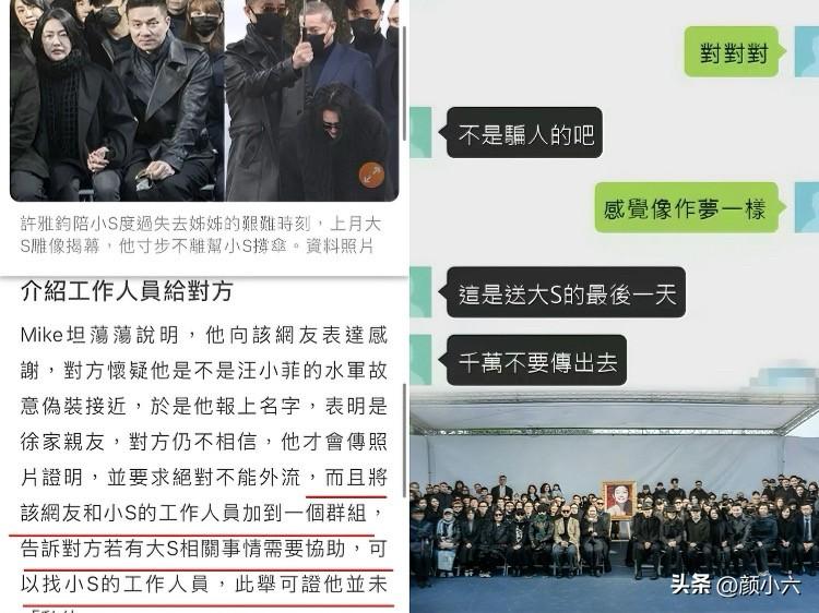 许雅钧私下联系大S粉丝,还发人家出殡现场的照片,这波操作真是踩穿了做人的底线。 小S辛苦维持了这么多年的“幸福婚姻”滤镜,算是彻底碎了。 原来她那个老公,从来就没把这个家放在心上。 这些年,他在外头花边新闻没断过,夜店泡妹、私生子传闻,连装都懒得装。 S妈还替他说话,说他“善良、容易被骗”,这说法就特别讽刺。 对比一下,具俊晔天天被夸深情宠妻,汪小菲出钱出力却被骂得最惨。 敢情这一家子的标准是看人下菜碟,专挑老实人欺负。 说白了,有些人你是捂不热的。 婚姻里连基本的忠诚和尊重都没有,还谈什么善良? 只是苦了小S,明明被伤透了,还得在镜头前替他圆场。 这场戏,看客都累了,唯独她还在戏里没出来。大S追思
