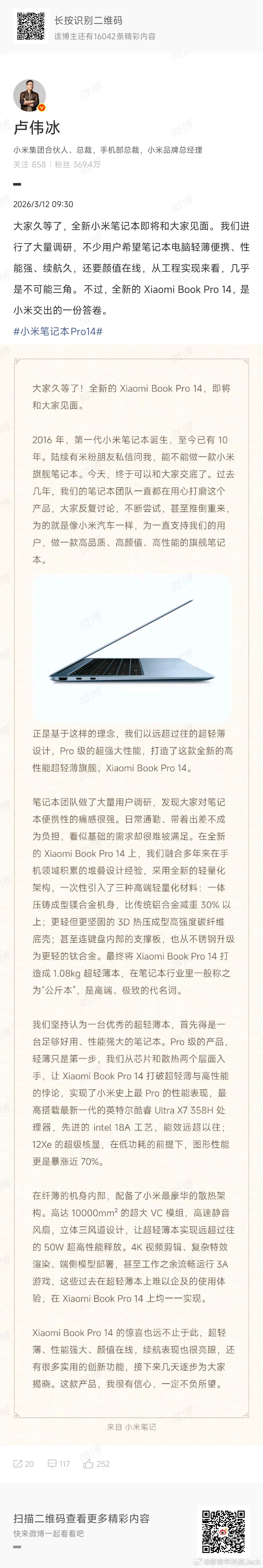 卢伟冰官宣小米笔记本新品即将发布 期待很久的小米旗舰超薄本终于来了,小米笔记本即将推出全新Xiaomi Book Pro 14,重量确实很轻只有1.08kg,薄约14.95mm,至高搭载第三代英特尔酷睿Ultra X7 358H处理器。从官方透露的关键数据和配置来看,确实主打的就是性能、便携、高端、精致的需求和场景。