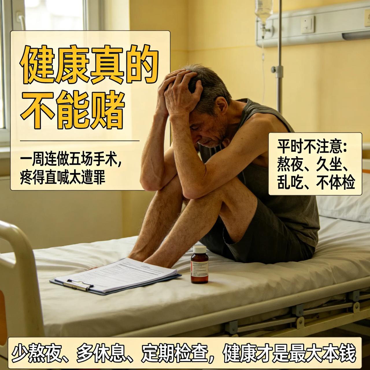 今天才明白,健康真的不能赌 一位男子一周连做五场手术,疼得直喊太遭罪,看着都揪心。 不是大病,全是平时不注意攒下的小毛病:熬夜、久坐、乱吃、不体检。 小病拖成大麻烦,一次遭罪全补上,花钱又受罪,人还瘦了一圈。 人到中年,别拿身体硬扛,你对身体敷衍,身体就会给你教训。 健康才是最大的本钱,少熬夜、多休息、定期检查,比啥都强。 你平时会注意身体吗? 健康警示 生活感悟 健康警示 生活感悟 人间清醒