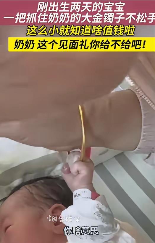 “笑不活了!”江苏,奶奶来看刚出生两天的宝宝。宝宝突然抓住奶奶的大金镯子不松手。奶奶问宝宝: “啥意思?”宝宝的妈妈说: “这么小就知道啥值钱,跟奶奶说,就要这个。” 病房里的气氛瞬间被这一幕逗得热闹起来,刚生产完两天的妈妈靠在床头,看着眼前的画面忍不住笑出了声。刚出生两天的新生儿浑身软乎乎的,眼睛都还没完全适应外界的光线,小拳头却攥得格外用力,指尖死死勾着奶奶手腕上的金镯子,怎么都不肯松开。奶奶一开始还轻轻晃了晃手腕,想把镯子抽出来,可宝宝的抓握力气比旁人想象中要大,越是挪动,小家伙抓得越紧。 奶奶看着怀里连哭闹都细声细气的小孙辈,脸上的笑意根本藏不住,俯下身轻声问出那句“啥意思”,语气里全是藏不住的宠溺。站在一旁的家人都凑过来看热闹,谁也没料到刚出生没多久的小婴儿会有这样可爱的举动,妈妈顺着氛围打趣的那句话,更是让整个病房都充满了欢声笑语。奶奶听完儿媳的话,当场就笑着表态,别说一个镯子,只要孩子喜欢,什么都愿意给。 很多网友看到这一幕都觉得是孩子天生机灵,小小年纪就识货,可从新生儿发育的科学角度来看,这只是宝宝正常的生理反应。新生儿出生后会自带先天握持反射,这是人类与生俱来的本能反应,只要手掌接触到条状、环状的物体,就会自动做出抓握动作,这种反射一般会持续到婴儿3-4个月大,并非是宝宝真的能分辨出物品的价值。 家人也清楚这是宝宝的本能反应,没有人真的觉得孩子是冲着金镯子去的,大家享受的是新生命到来带来的这份趣味。奶奶专程赶来医院看望新生儿,本就带着满心的期待和疼爱,手腕上的金镯子,也是长辈对晚辈的一份心意寄托。在老一辈的观念里,金饰不仅是饰品,更是平安、福气的象征,提前戴在身上,也是想把好兆头带给刚出生的小孙辈。 这样看似搞笑的小片段,藏着的是最朴实的隔代亲。没有刻意的表演,没有精心的设计,只是家庭迎接新生命时,最自然、最真实的瞬间。现在的年轻人总在记录生活里的细碎美好,这类家庭日常之所以能让人觉得暖心,就是因为它脱离了刻意的煽情,用最平凡的互动,展现出一家人对新生命的欢迎和喜爱。 江苏当地的家庭大多看重亲情联结,新生儿降生本就是全家的大喜事,长辈探望、准备心意、晚辈打趣逗乐,都是再正常不过的家庭互动。这个小视频能在网络上引发共鸣,核心从来不是那只金镯子,而是画面里藏不住的爱意,是奶奶的慈爱、妈妈的俏皮,还有新生儿带来的满满生机。 生活里的幸福从来都不是靠贵重物品堆砌的,往往是这些无厘头的小瞬间、不经意的小互动,拼凑出了家庭最温暖的模样。新生儿的懵懂无知,长辈的毫无保留,家人之间的轻松打趣,拼凑成了最治愈人心的画面。 各位读者你们怎么看?欢迎在评论区讨论。
