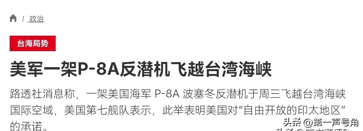 真嚣张!在伊朗脱不开身,美国竟然在台湾又对我们进行挑衅!3月12日,根据法新社报道,法媒称,一架美国海军 P-8A 波塞冬反潜机于周三飞越台湾海峡,美国第七舰队对此表示称,美国按照国际法在台湾海峡行动,美国维护所有国家的航行权和自由。很显然,美国战机在台海飞行,明显是故意为之。 评几句 3月12日,美国海军P-8A"波塞冬"反潜巡逻机悍然飞越台湾海峡,第七舰队还大言不惭地搬出"国际法"和"航行自由"当挡箭牌。这种赤裸裸的挑衅行径,暴露了华盛顿在伊朗问题焦头烂额的当下,仍不忘在台海方向对华施压的险恶用心。 美方所谓"按国际法行动"纯属欺世盗名。台湾海峡最窄处仅约70海里,根据《联合国海洋法公约》,中国对该水域享有主权权利和管辖权。美军机蓄意穿越,绝非无害通过,而是典型的军事炫耀与政治试探。第七舰队的声明刻意强调"维护所有国家航行权",实则是将台湾海峡等同于公海,为"台独"势力撑腰打气,粗暴干涉中国内政。 当前美国深陷中东泥潭,伊朗问题久拖不决,国内政治极化加剧。在此背景下,华盛顿急迫需要在亚太制造事端,转移国内视线,同时向盟友展示"美国仍在"。这种"拆东墙补西墙"式的霸权维护,恰恰暴露了超级大国江河日下的战略焦虑。台海不是美国展示肌肉的舞台,更不是其解决内部困境的工具。 台湾问题是中国核心利益中的核心,是中美关系第一条不可逾越的红线。美军机每一次抵近侦察,都在消耗中美战略互信,都在将台海推向危险边缘。历史反复证明,任何外部势力妄想"以台制华",最终只会搬起石头砸自己的脚。