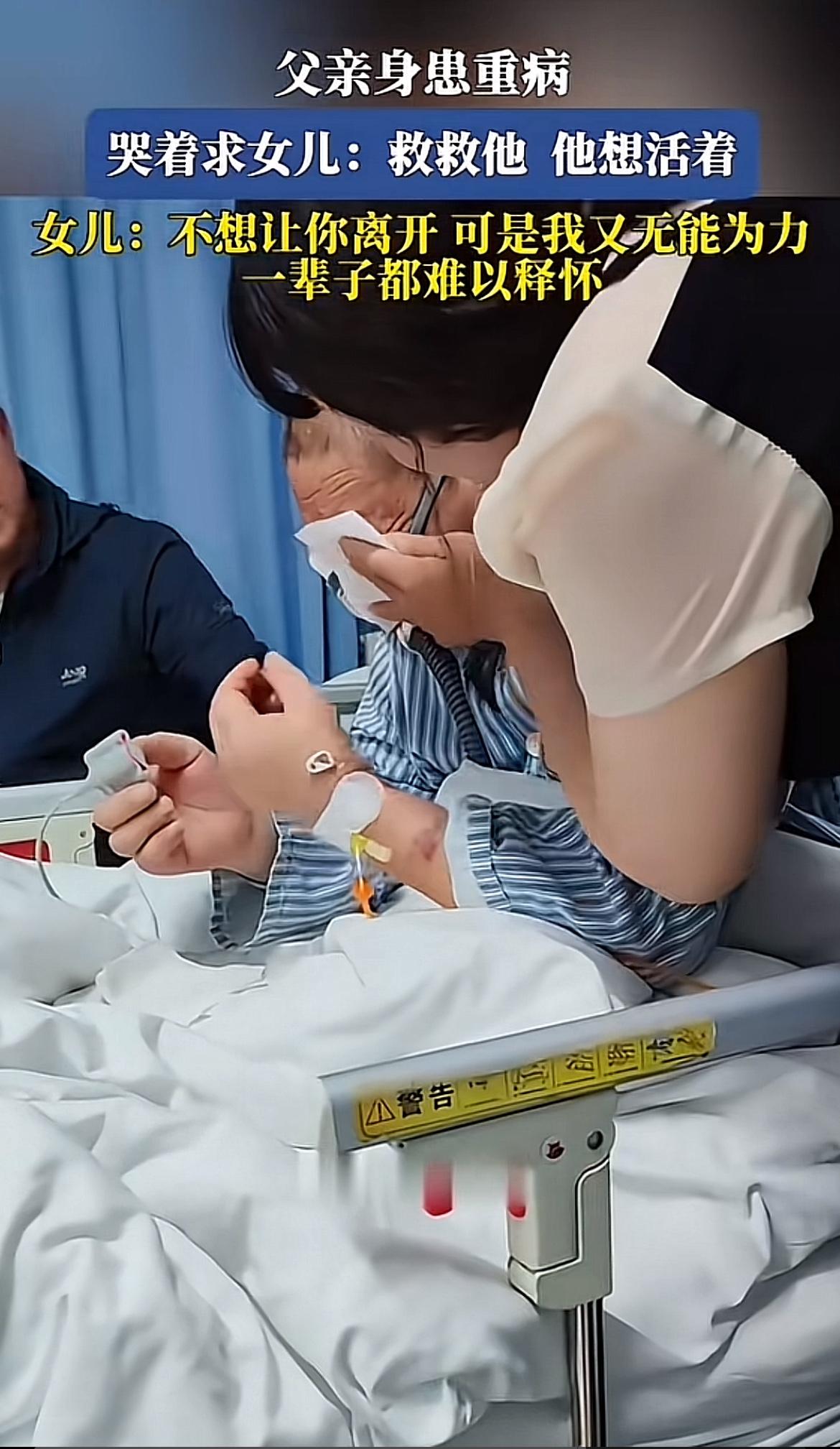 医院的病房里,弥漫着消毒水的味道,压抑又沉重。病床上的老人满脸憔悴,眼中满是泪水,无助地祈求女儿救救自己。 女儿站在一旁,眼神里满是无奈与坚持。她不是不想救,这些年为了给父亲治病,家里的积蓄早已花光,还欠了一屁股债。她白天黑夜地工作,身体和精神都到了极限。医生也委婉地说治疗效果可能不佳,继续治疗只是徒增痛苦和费用。 女儿的坚持,是不想让父亲最后时光在无尽的治疗中度过;她的无奈,是面对亲情和现实的两难。这一幕,让人看了无比心酸。