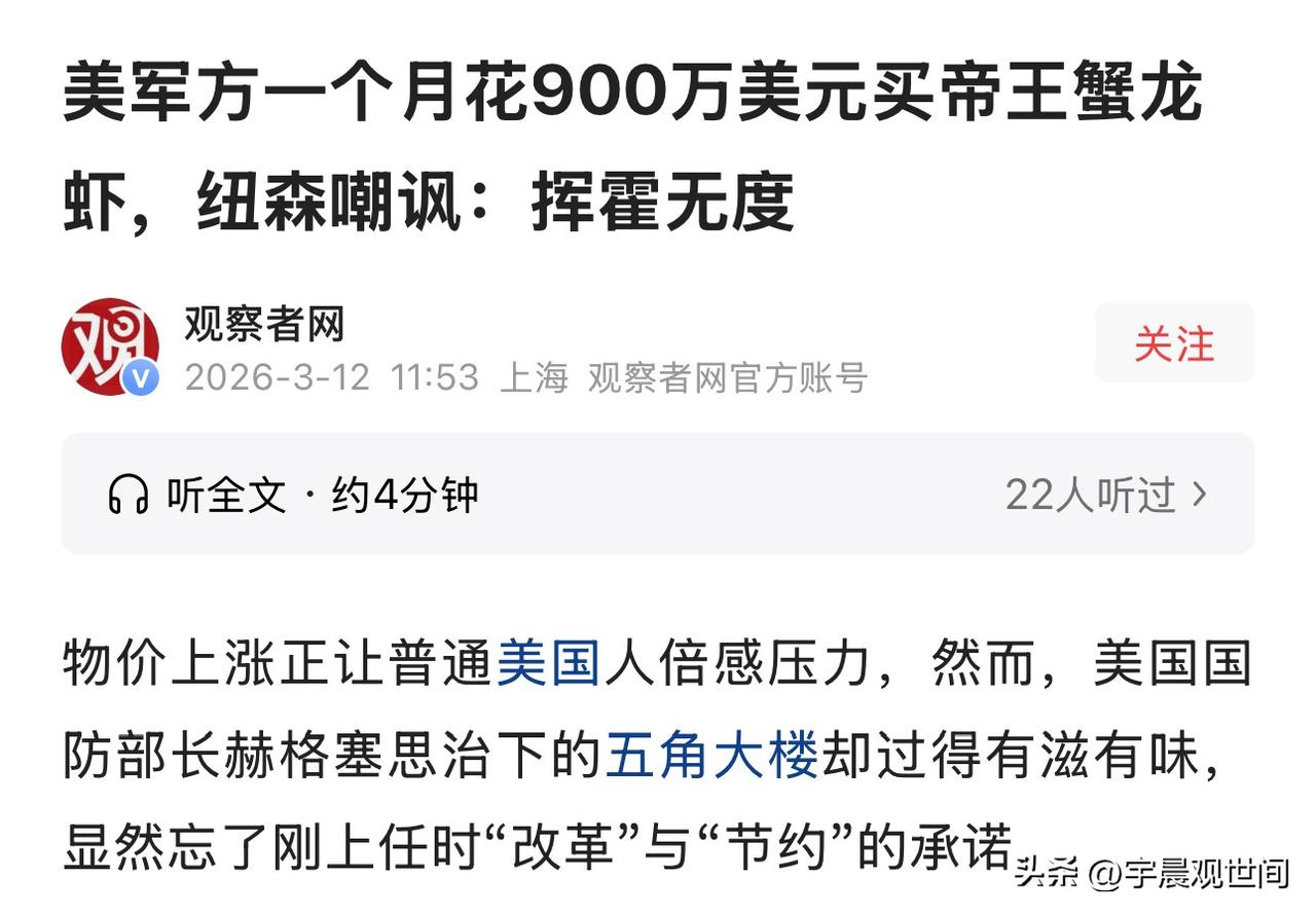 美国军方太腐败了,竟然花了900多万美元买帝王蟹和龙虾,这么腐败的军队已经在走下坡路了,战斗力会大大减弱,我们要保持警惕!