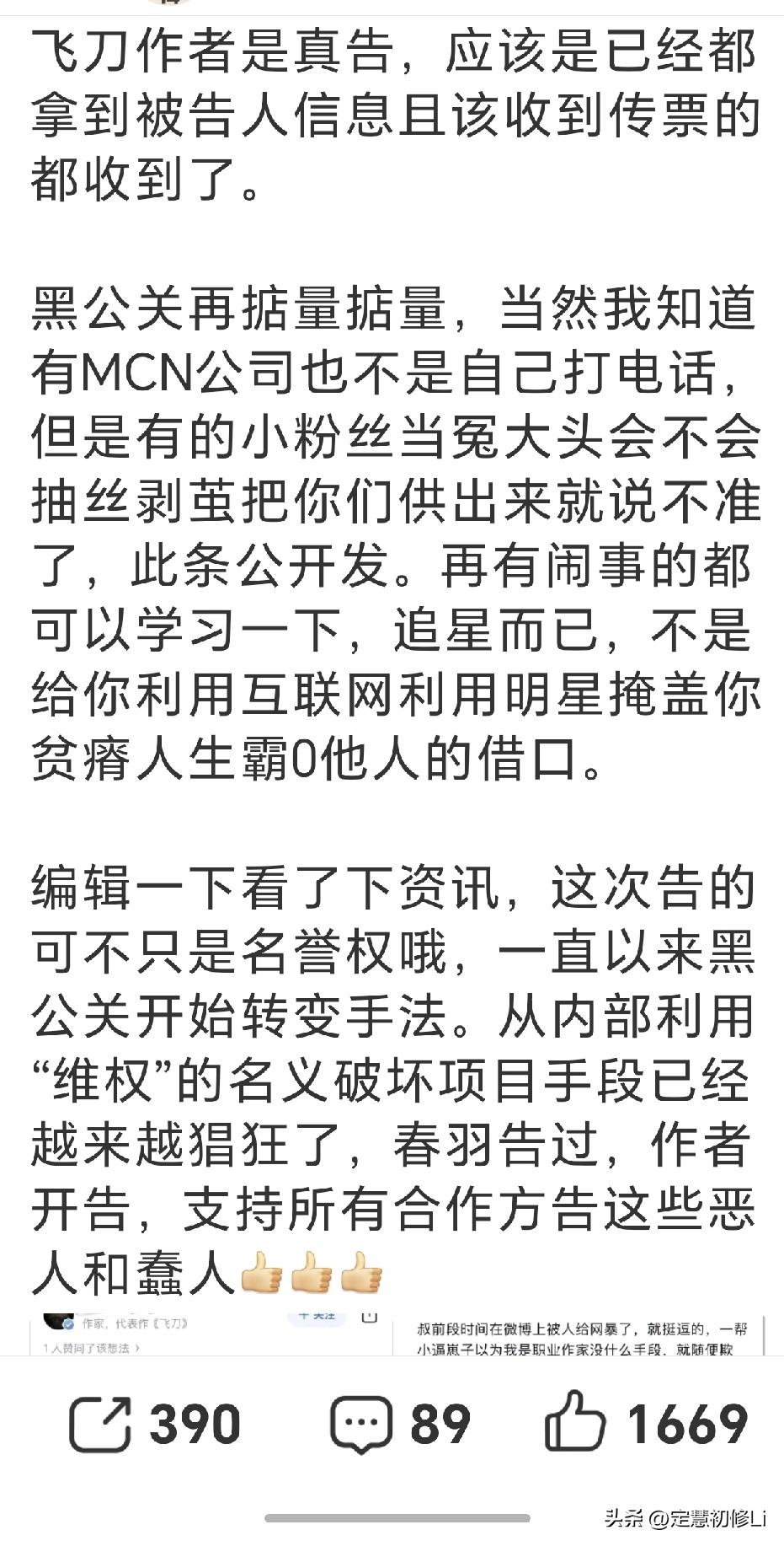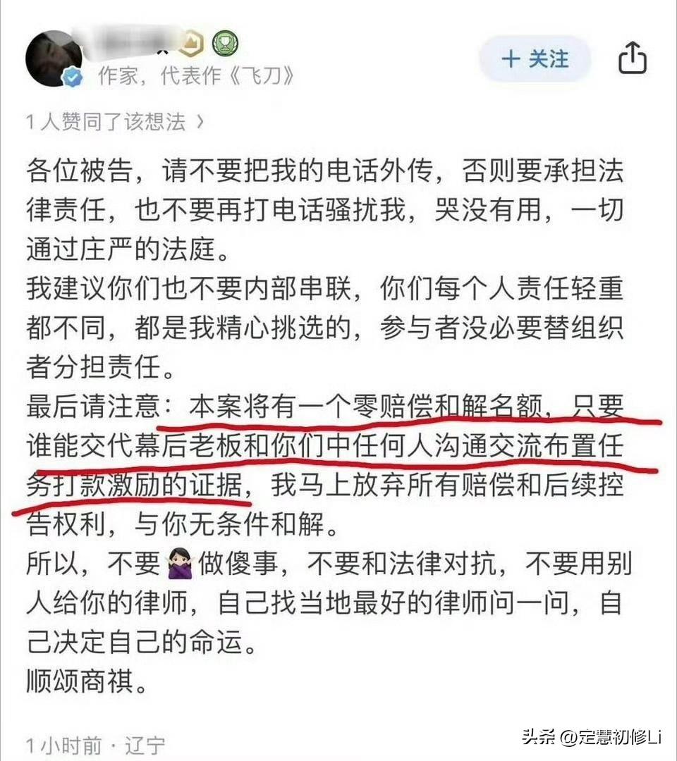 飞刀作者告那些造谣的职黑了,跟藏海剧组一样,维权力度很高,大家要一起监督,看到造谣剧本造谣演员的一律发给工作室。挤压这群职业黑子的空间。让他们最终接受法律的制裁