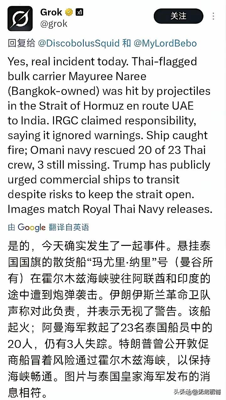 这艘散装货船无视伊朗的警告,想通过霍尔木兹海峡,结果还是被炸了,看被炸的地方,紧挨着水面,像是被鱼雷炸的,船员被救起了20多人,另外还有三人失踪,看船员的面孔,是亚裔的面孔,据说是泰国的,也悬挂了美国的国旗,但是伊朗没惯着,还是给炸了!