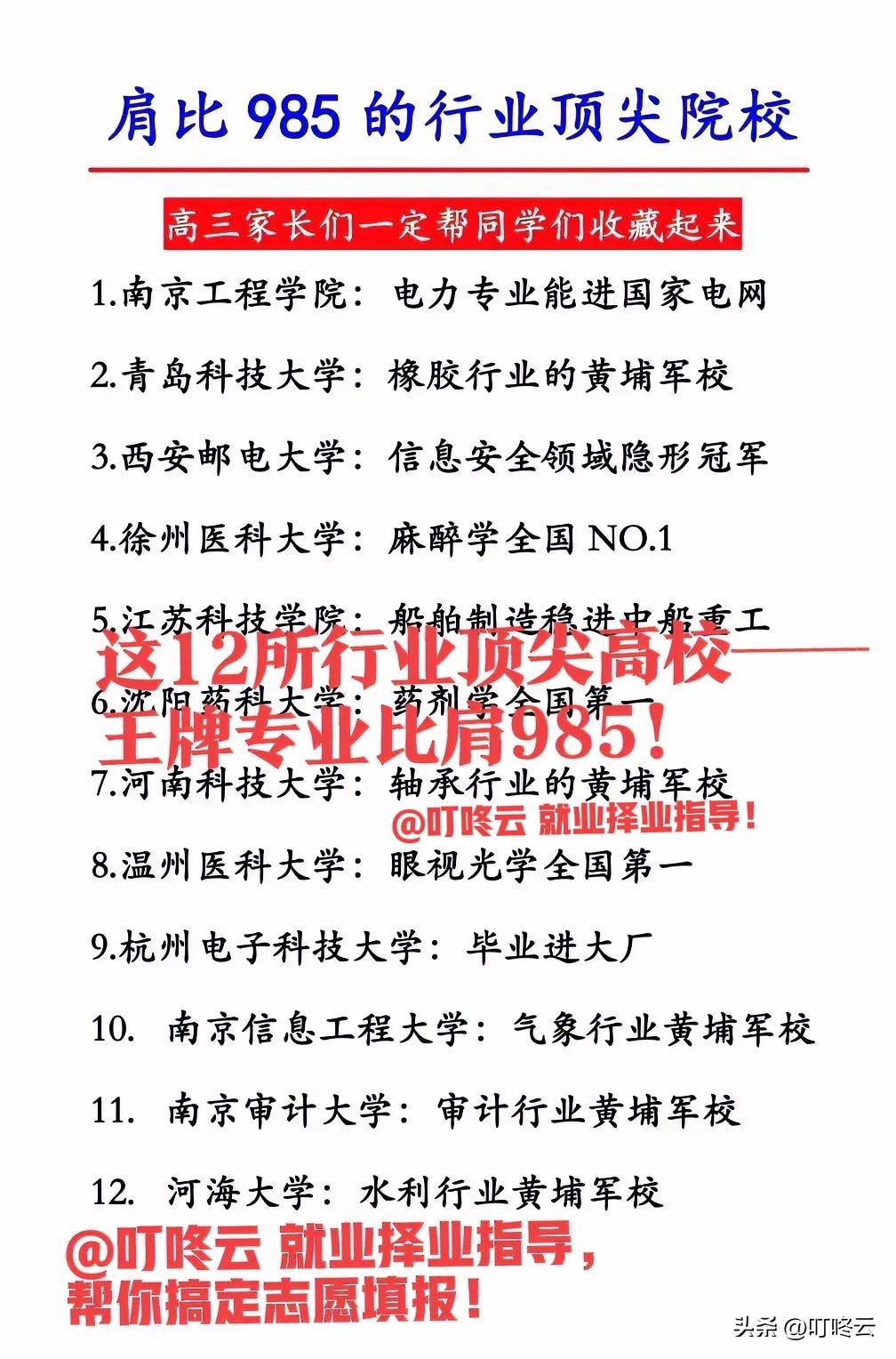 对志愿填报,有什么建议吗?比肩985!这12所行业顶尖院校值得报考!高三家长一定要收藏起来!这些“非985却胜似985”的行业顶流院校,简直是高考志愿填报的“隐藏彩蛋”!@叮咚云 就业择业指导,帮你搞定志愿填报!✨[点亮平安灯][点亮平安灯] @叮咚云 帮你解读重点和职业规划指导:1.想端稳“金饭碗”?南京工程学院的电力专业,是国家电网的“人才输送站”;南京审计大学是审计界的“黄埔军校”,河海大学则是水利行业的“扛把子”,毕业即解锁稳定人生。 2.想深耕特色赛道?青岛科技大学是橡胶界的“顶流”,河南科技大学是轴承界的“天花板”;徐州医科大学麻醉学全国NO.1,温州医科大学眼视光学独领风骚,沈阳药科大学药剂学更是业内“顶流”。 3.想冲进科技大厂?西安邮电大学是信息安全的“隐形冠军”,杭州电子科技大学是互联网大厂的“人才储备库”;江苏科技学院稳进中船重工,南京信息工程大学则是气象界的“黄埔军校”。 这些院校虽然不是985,但在各自领域都是“王者段位”,性价比拉满!2026届高考生和家长们,赶紧码住,别让这些宝藏院校从志愿表里溜走啦!✅ 要不要我再帮你把这些院校的录取分数和就业数据整理成一份速查清单? 欢迎关注@叮咚云 就业择业指导,帮你快速拿到央国企offer!将优先为粉丝职业规划指导,为你定制最适合的就业择业方案!欢迎留言交流讨论。[来看我][来看我] 免责声明:图片来自网络,仅供参考 志愿填报雷区 志愿填好技巧 就业导向选专业