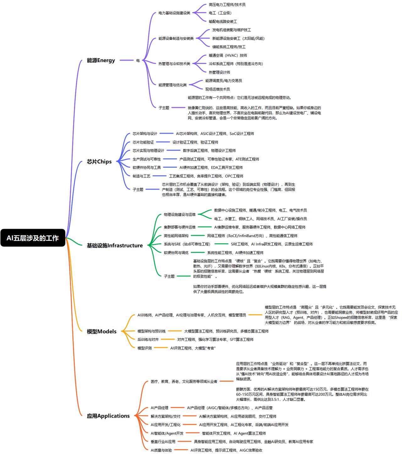 按AI五层蛋糕整理了需要人的工作: 能源Energy 电 电力基础设施建设类 高压电力工程师/技术员 电工(工业级) 输配电线路安装工 能源设备制造与安装类 发电机组装配与维护技工 新能源设施安装工(太阳能/风能) 储能系统工程师/技工 热管理与冷却技术类 暖通空调(HVAC)技师 冷却系统工程师(特别是液冷方向) 热管理设计师 能源管理与优化类 能源调度员/电力交易员 现场运维技术员 子主题 能源层的工作有一个共同特点:它们是无法被远程完成的物理劳动。 就像黄仁勋说的,这些是高技能、高收入的工作,而且目前严重短缺。如果你或身边的人擅长动手、喜欢物理世界,不喜欢坐在电脑前敲代码,那么为AI建设发电厂、铺设电网、安装冷却管道,会是一个非常稳定且前景广阔的方向。 芯片Chips 芯片架构与设计 AI芯片架构师、ASIC设计工程师、SoC设计工程师 芯片功能验证 设计验证工程师、验证工程师 芯片实现与物理设计 数字后端工程师、物理设计工程师 生产测试与可靠性 产品测试工程师、可靠性验证专家、ATE测试工程师 软硬件协同与工具 AI硬件加速工程师、EDA工具开发工程师 制造与工艺 工艺集成工程师、良率提升工程师、OPC工程师 子主题 芯片层的工作机会覆盖了从前端设计(架构、验证)到后端实现(物理设计),再到生产制造(测试、工艺、可靠性)的全流程。这个领域的岗位专业性强、门槛高,但回报也相当丰厚,是AI硬件基础的直接构建者。 基础设施Infrastructure 物理设施建设与运维 数据中心设施工程师、暖通/制冷工程师、电工、电气技术员 电工、水管工、钢铁工人、网络技术员、AI工厂安装/操作员 集群部署与硬件运维 AI集群运维专家、服务器硬件工程师、数据中心网络工程师 高性能网络架构 网络工程师(RoCE/InfiniBand方向)、高性能通信工程师 系统与SRE(站点可靠性工程) SRE工程师、AI Infra研发工程师、云原生运维工程师 软硬协同与调优 系统性能工程师、AI硬件加速工程师 子主题 基础设施层的工作特点是 “硬核”且“复合”。它既需要你懂得物理世界(如电力、散热、光纤),又需要你理解数字世界(如Linux内核、K8s、分布式通信)。正如平头哥的招聘信息所言,这需要从业者 “热爱‘硬核’系统工程,关注物理层到网络层的极致性能” 。 如果你对动手部署硬件、优化网络延迟或者维护大规模集群的稳定性感兴趣,这一层提供了大量极具挑战性的高薪岗位。 模型Models AI训练师、AI产品经理、AI伦理与治理专家、人机交互师、模型管理员 模型层的工作特点是 “高精尖”且“多元化”。它既需要能发顶会论文、探索技术无人区的研究型人才(预训练、对齐),也需要能洞察业务、将模型封装成好用产品的应用型人才(RAG、Agent、产品经理)。正如Shopee的招聘信息所言,这里是 “探索大模型能力边界” 的战场,对从业者的学习能力和前沿敏感度要求极高。 模型架构与预训练 大模型算法工程师、预训练研究员、多模态算法工程师 后训练与对齐 对齐工程师、强化学习算法专家、SFT算法工程师 模型评测 AI评测工程师、大模型"考官" 应用Applications 医疗、教育、养老、文化服务等领域从业者 应用层的工作特点是 “业务驱动”和“复合型”。这一层不再单纯比拼算法论文,而是要求从业者具备技术理解力 + 业务洞察力 + 工程落地能力的复合素质。人才需求也从"懂AI技术"转向"用AI改造业务",能够结合具体场景设计AI落地路径的人才成为市场稀缺资源。 AI五层涉及的工作 薪酬方面,优秀的AI解决方案架构师年薪最高可达150万元,多模态算法工程师年薪在60-150万元区间,具身智能算法工程师年薪最高可达200万元。整体AI岗位需求同比大幅增长,需供比达到3.5:1,人才缺口显著。 AI产品经理 AI产品经理(AIGC/智能体/多模态方向)、AI产品运营 解决方案架构/交付 AI解决方案架构师、AI应用咨询顾问、交付工程师 AI应用开发/工程化 AI应用开发工程师、AI工程化专家、后端/前端AI应用开发 AI智能体/Agent开发 智能体开发工程师、AI Agent算法工程师 垂直行业AI应用 具身智能应用工程师、自动驾驶应用工程师、金融AI研究员、教育AI应用专家 AI质量与体验 AI评测工程师、提示词工程师、AIGC效果验收