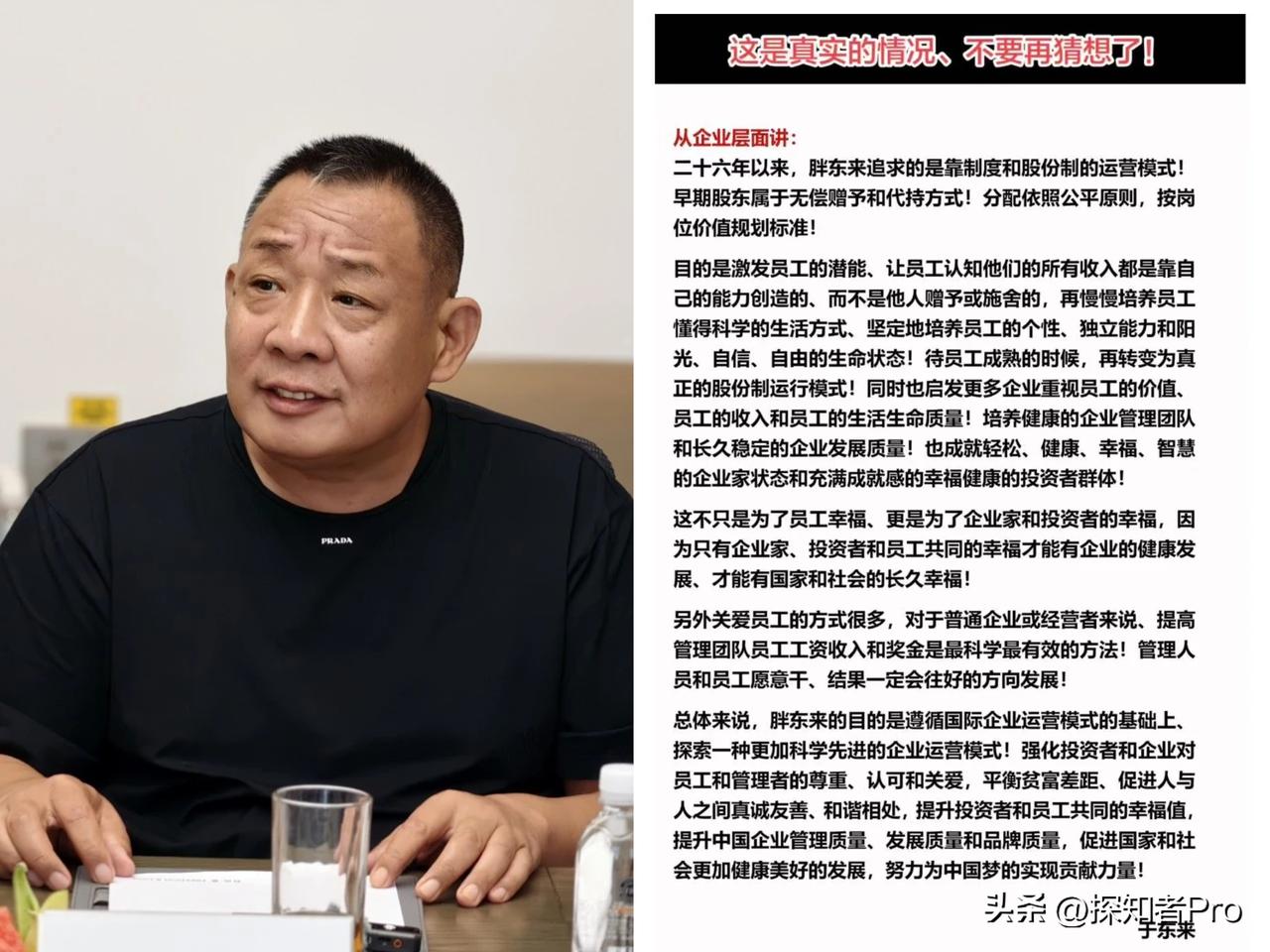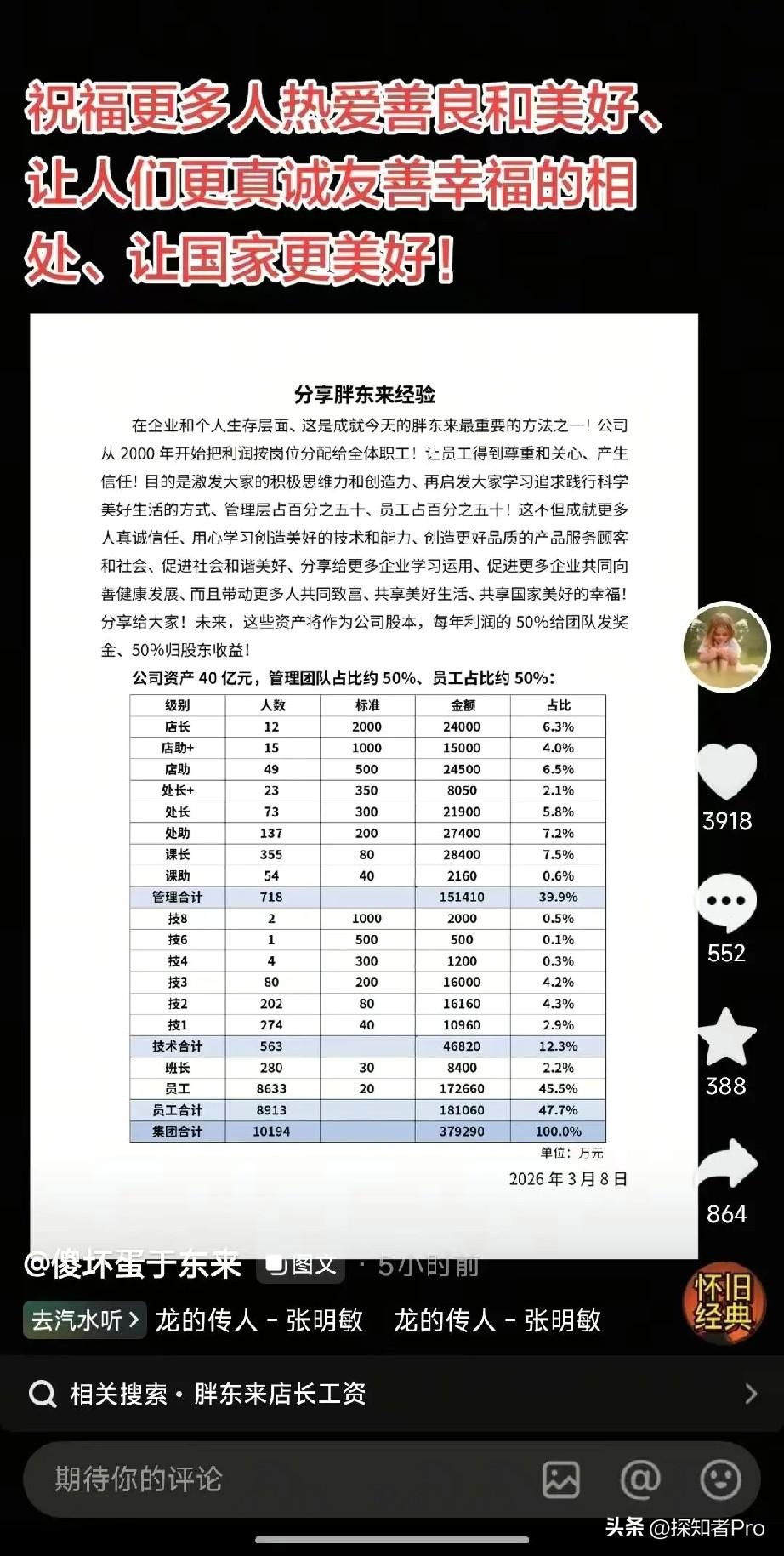 于东来证实胖东来“分钱”猜想 道出普通员工人均分得20万的深层目的: 不是施舍或赠予 而是“激发员工的潜能、让员工认知他们的所有收入都是靠自己的能力创造的” 3月8日,胖东来公布40亿资产分配方案显示: 🔸12名店长,每人2000万,合计2.4亿 🔸普通员工人均20万,合计17.266亿 这数据一经公布,引发了很多网友对公告数据真实性的猜疑。 于东来3月11日,用一句“这是真实的情况,不要再猜想了!”证实了公告数据的真实性。 不得不说,胖东来的这种激励方式下,哪一个员工不会真正把企业当家?哪个员工不会团结一致,想方设法做好工作,争取向上,为建设自己的“家”而拼搏努力? 企业把员工当家人对待,员工自然会努力建设好自己的家,正如那句话:别人是怎么对待你,取决于你是怎么对待别人! 在这种充满“爱”的企业工作,员工团结、开心、努力、上进,万众一心,还怕自己的企业会不能做强做大吗 (消息、数据来源:每日经济新闻)