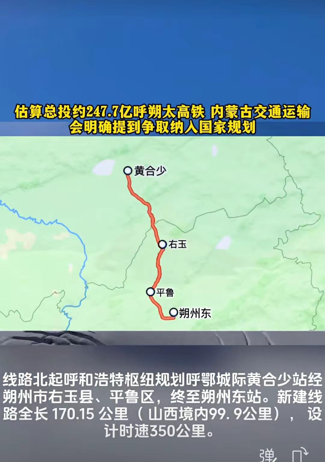 线路新建车站3座,工期4年。已经完成预可研编制;呼和浩特新机场综合交通枢纽(高铁预留)工程和集大原高铁朔州东站已预留呼朔太高铁引入条件。已列入山西省“十四五”现代综合交通运输体系发展规划,正持续加快推进呼朔高铁建设前期工作,力争早日列入国家铁路建设规划和开工建设。2026年1月14日内蒙古交通运输会明确表述为“争取呼朔太高铁……等项目纳入国家规划”,定位为前期储备与向上争取项目。