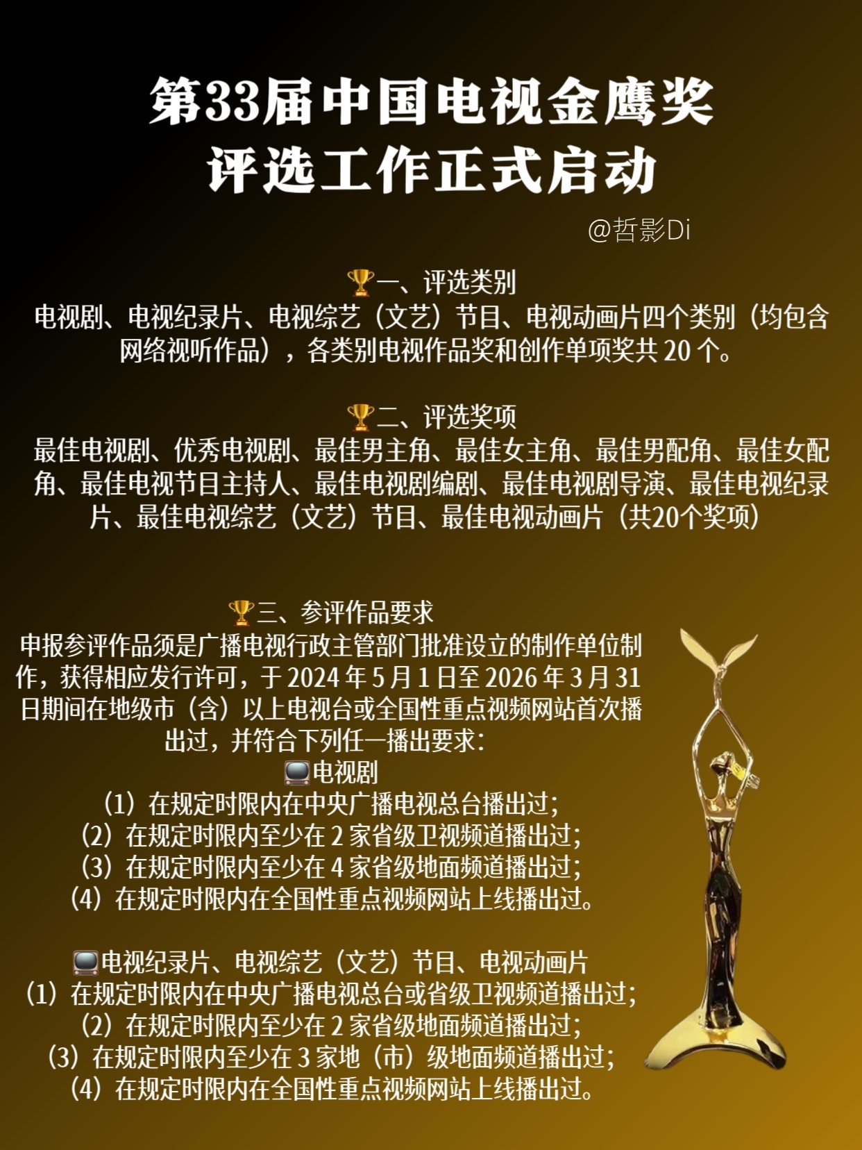 第33届金鹰奖启动第33届中国电视金鹰奖今日宣布正式开启评选工作,本届金鹰奖的参评时间范围为2024年4月1日-2026年3月31日的电视剧、电视纪录片、电视动画片、电视综艺等作品,将选出最佳电视剧、最佳男女主角、最佳男女配角等20个奖项。