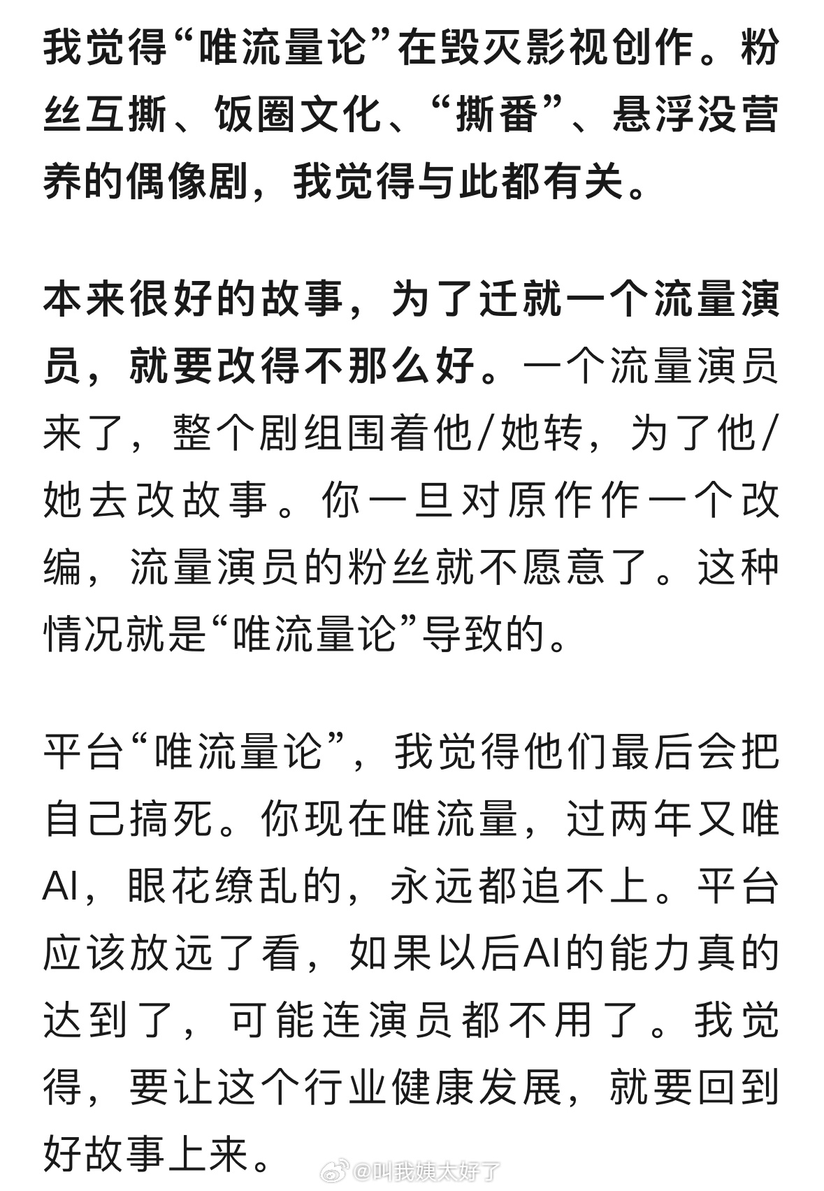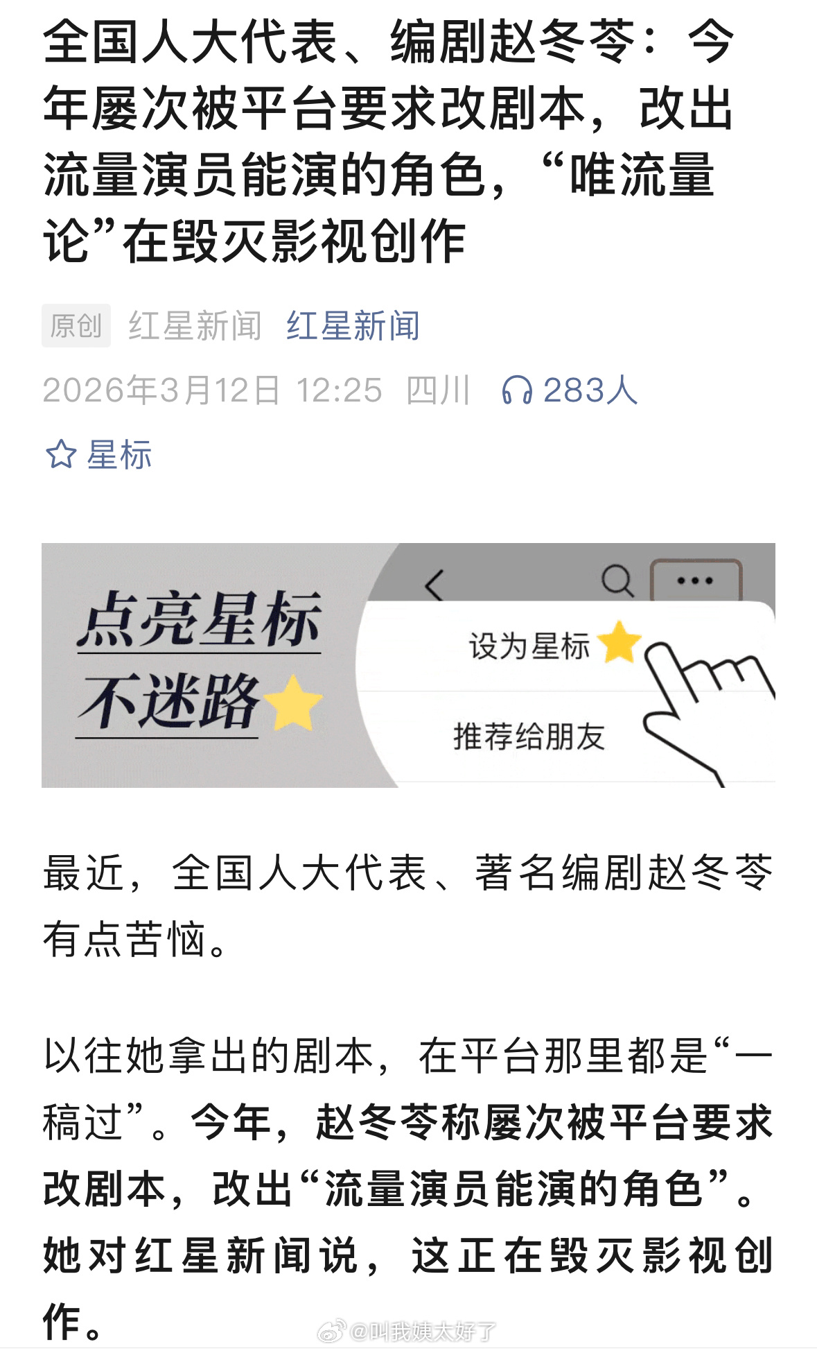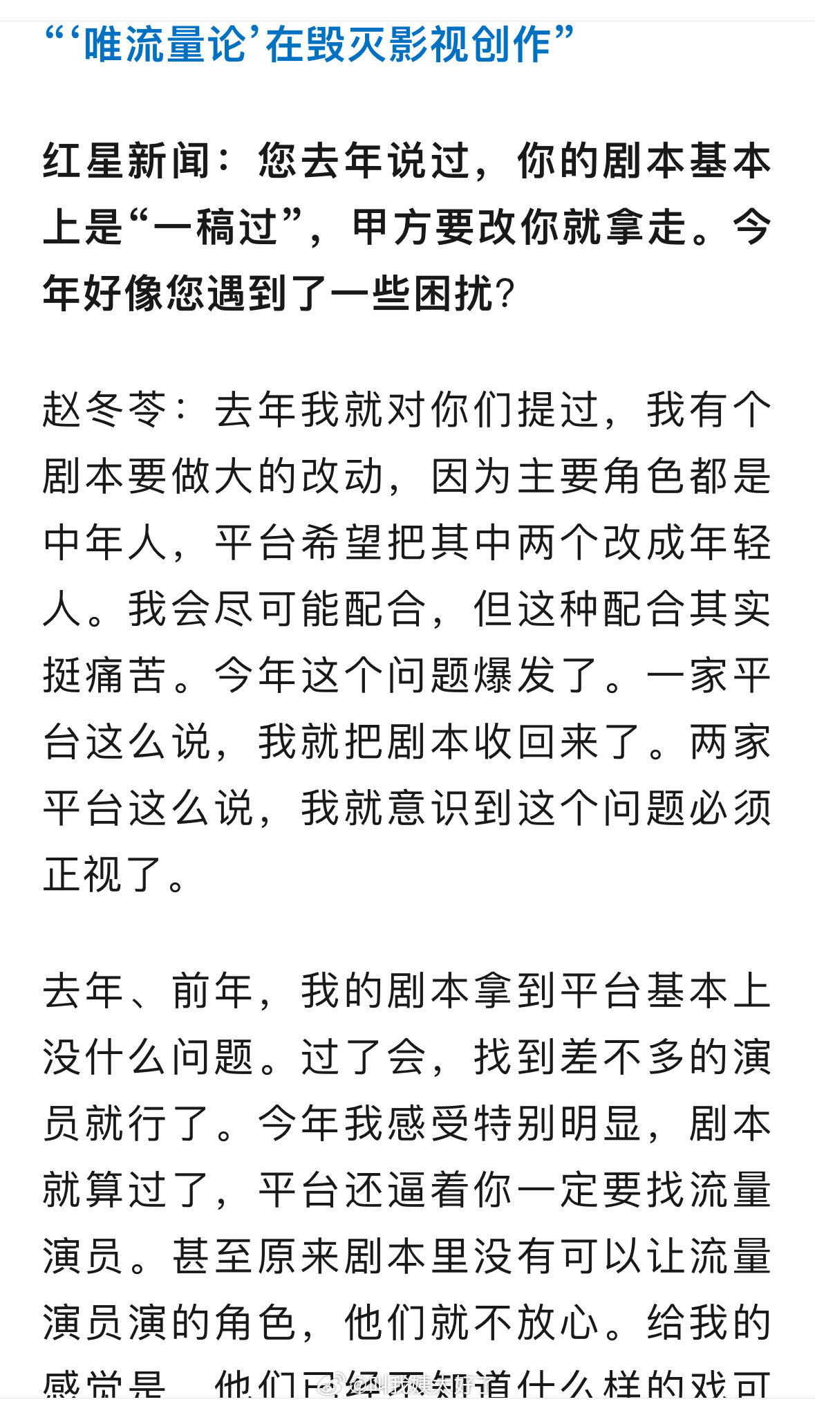 赵冬苓:“唯流量论”在毁灭影视创作。1.自己有个剧本要做大改动,中年人改成年轻人