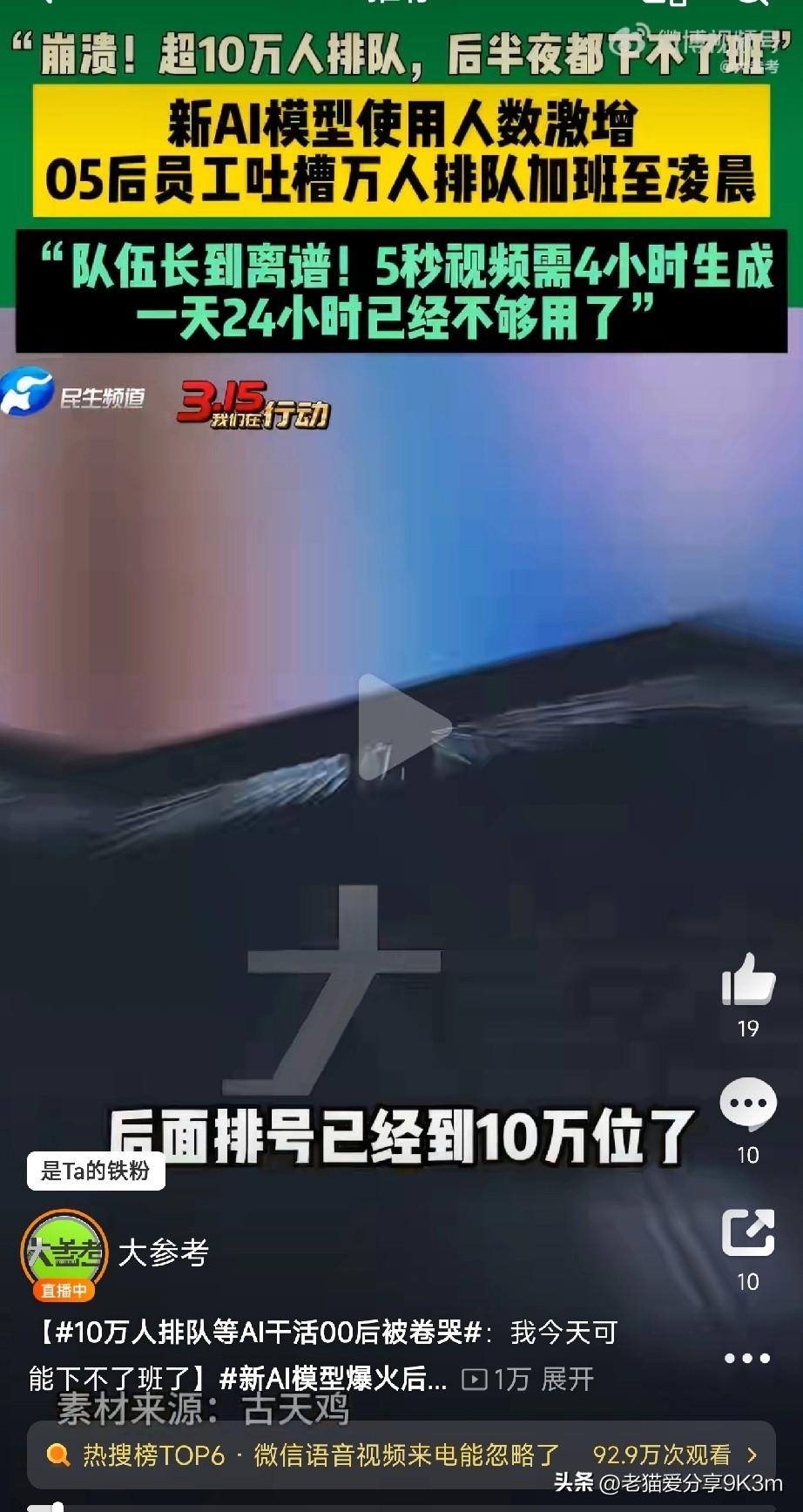 新AI模型爆火后的众生相 河南郑州的05后AI打工人直接崩溃:“超10万人排队!干到后半夜都下不了班!” 新出的AI模型爆火到离谱,生成个5秒视频居然要等4小时!队伍长到能绕地球两圈,00后们直接被逼到“怀疑人生”…… 郑州的05后小伙伴吐槽:“我现在排到第8万号,前面还有10万人!一天要赶12个视频,按这速度,今晚别想下班了!” 为了快点生成,有人甚至错峰熬夜干活,结果晚上照样排到“心碎”——等四五个小时都是常态!有网友怒喊:“这AI是去喝茶了吗?这么慢,我还不如自己手动做!” 说好的AI解放双手呢?现在好了,AI不干人事,人类倒被它卷到飞起!00后打工人:这班,真不是人上的! 你们有没有被AI拖慢进度的经历?快来说说你排到第几号了? (文章素材来自大参考,侵删)
