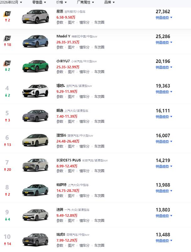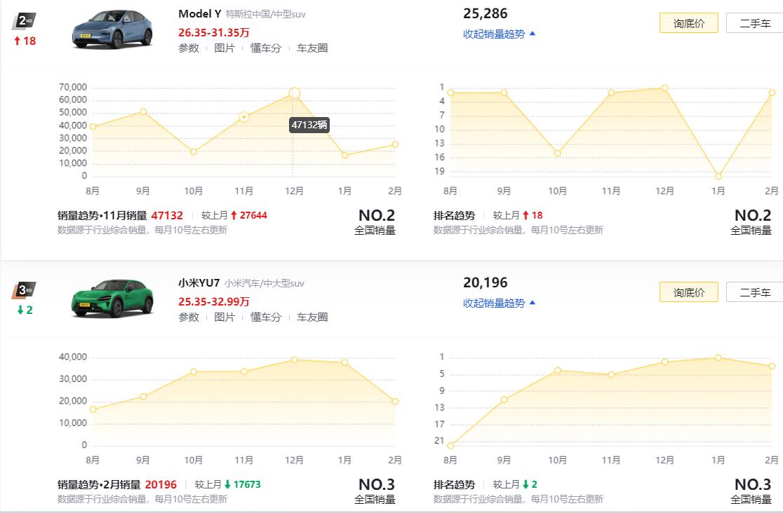 都说2月销量惨淡,那有哪些车逆势向上? 翻看排名前列的车型,月销过2万的车型仍有三款 而且都是熟悉的选手,包括销冠吉利星愿、第二Model Y、第三小米YU7 值得一提的是,Model Y是难得实现环比上涨的车型,排名靠后的Model 3也是上涨 而其它车几乎都在下滑,比如第四的博越L、第五的朗逸 为什么特斯拉不降反增? 有数据显示,1月特斯拉出口占比较高,导致国内交付量下滑 其次Model Y更新+政策窗口期,观望情绪严重,拉低了1月交付基数