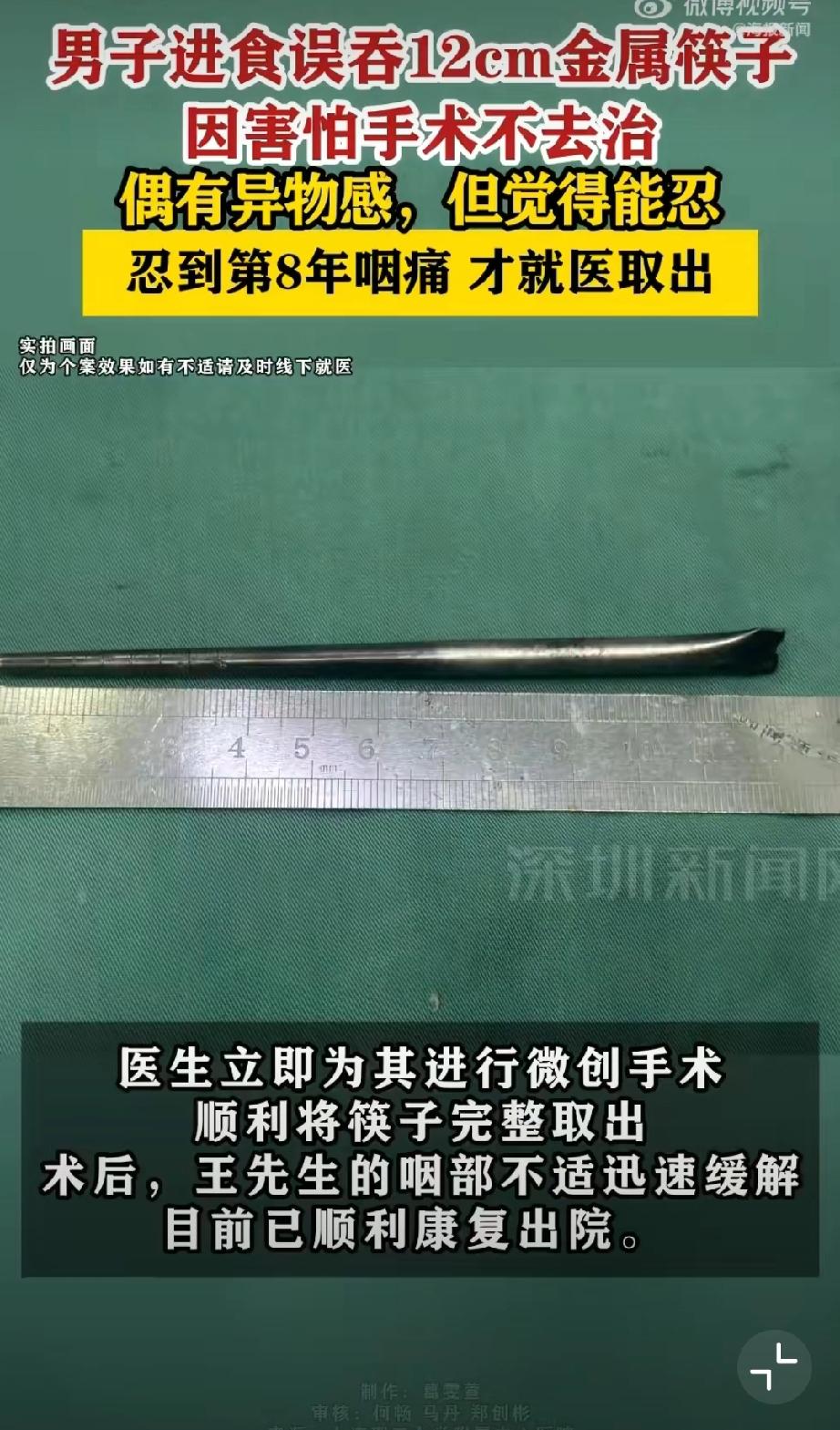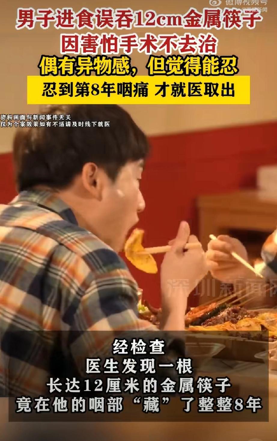 男子误吞12厘米筷子忍了8年才取出[what] 我不想知道他怎么忍了八年,我只想知道他怎么误吞的 [捂脸]儿童误吞 小孩被筷子刺伤 多久换筷子