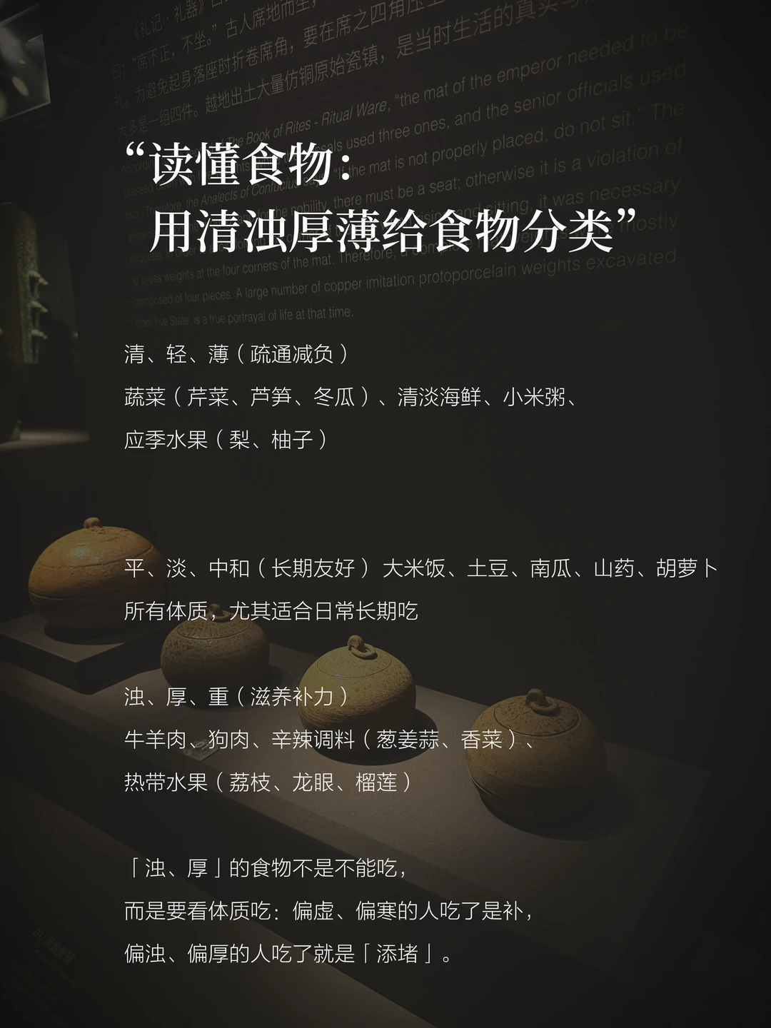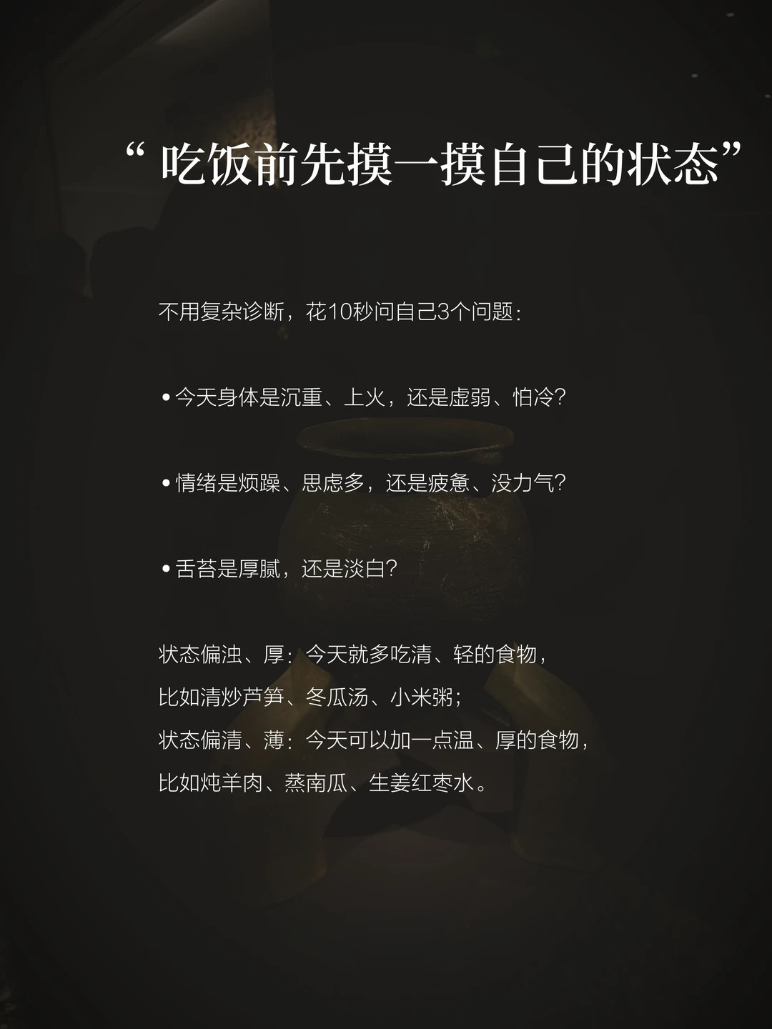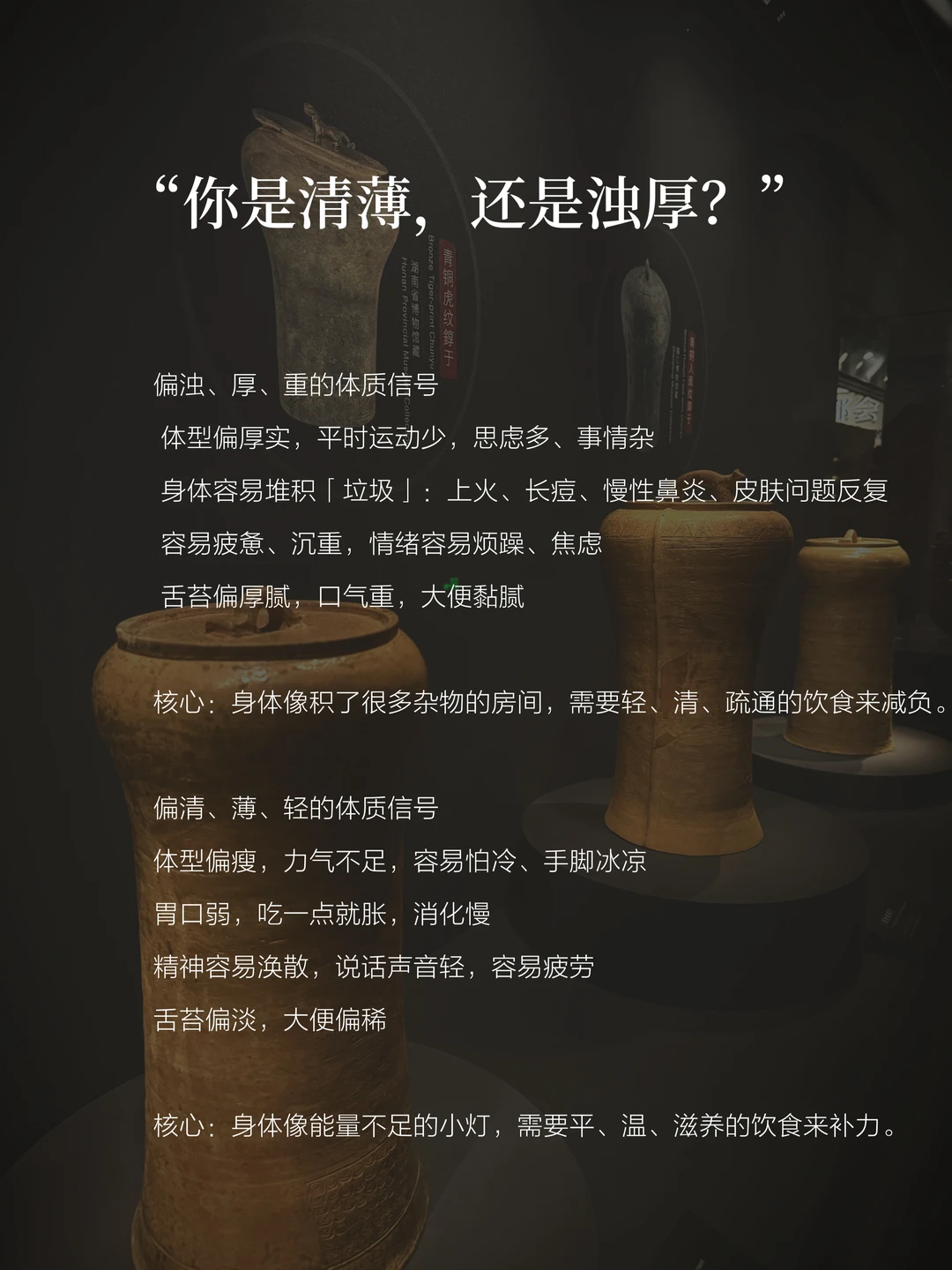 养脾胃气血多年,我终于戒掉了饮食焦虑,吃什么不重要,怎么吃才重要。 🍅分享我整理的干货,看完你也能自己判断今天该吃什么。 🔍 先测体质:你是浊厚型还是清薄型? ✅ 浊厚型信号(身体像积了杂物): 体型偏实、运动少、思虑多 容易上火长痘、鼻炎、皮肤差 舌苔厚腻、口气重、大便黏 👉 饮食目标:轻、清、疏通 ✅ 清薄型信号(身体像能量不足): 体型偏瘦、怕冷、手脚凉 胃口弱、消化慢、容易累 舌苔淡白、大便偏稀 👉 饮食目标:平、温、滋养 🍅再认食物:用清浊厚薄给食物分类,记住这个核心逻辑: • 清/轻/薄(疏通款):芹菜、芦笋、冬瓜、清淡海鲜、小米粥、梨/柚子 → 适合浊厚型,帮身体「减负」 • 平/淡/中和(长期款):大米饭、土豆、南瓜、山药 → 所有人都能长期吃,是身体的「稳定朋友」 • 浊/厚/重(滋养款):牛羊肉、葱姜蒜、香菜、荔枝/龙眼/榴莲 → 适合清薄型,少量吃补能量,浊厚型要少吃! 🍅3个直接能用的吃饭技巧 1️⃣ 饭前10秒「摸状态」 今天沉重上火→多吃清粥蔬菜 今天虚弱怕冷→加一点温厚食物(比如炖羊肉、蒸南瓜) 2️⃣ 给「浊厚食物」设上限 浊厚体质:牛羊肉/热带水果一周最多1-2次,别叠加吃(比如火锅+荔枝=身体过载) 清薄体质:把它们当「补剂」,别天天吃,避免补过头 3️⃣ 用烹饪中和属性 牛羊肉清炖+萝卜/冬瓜,减少「浊感」 葱姜蒜只当调料提味,别当菜吃 热带水果上午吃,配温水 🍅吃饭的方式,比吃什么更重要 脾胃喜温、喜缓、喜淡,这三点做到,比吃补药还养人: ✅ 吃暖的:三餐全温热,夏天也少冰饮,凉菜加姜末/醋中和寒性 ✅ 吃慢的:每口嚼15-20次,专心吃饭不刷手机,脾胃才好消化 ✅ 吃淡的:少盐少糖少重油,戒掉重口味依赖,身体没负担 ✅ 吃七分:吃到不饿就停,不撑肚,给脾胃留工作空间 最后想跟大家说: 饮食养生从来不是死守规则,而是找回对身体的感知 不用因为没吃养生餐而焦虑,不用因为偶尔吃零食而愧疚 把饭吃暖、吃慢、吃舒服,睡好觉、放平心,就是最长久的养生 身体很聪明,你对它温柔,它自然会给你反馈~