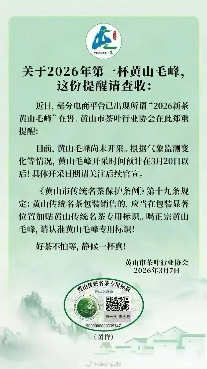【注意!#黄山毛峰尚未开采电商平台竟在售#】#2026黄山毛峰3月25日开采# 春天到了,不少茶友已惦记上2026年的黄山毛峰新茶了。先别急着下单!近日,黄山市茶叶行业协会发布提醒,表示部分电商平台已经出现所谓的“2026新茶黄山毛峰”在售,而事实上,今年的黄山毛峰尚未开采。
