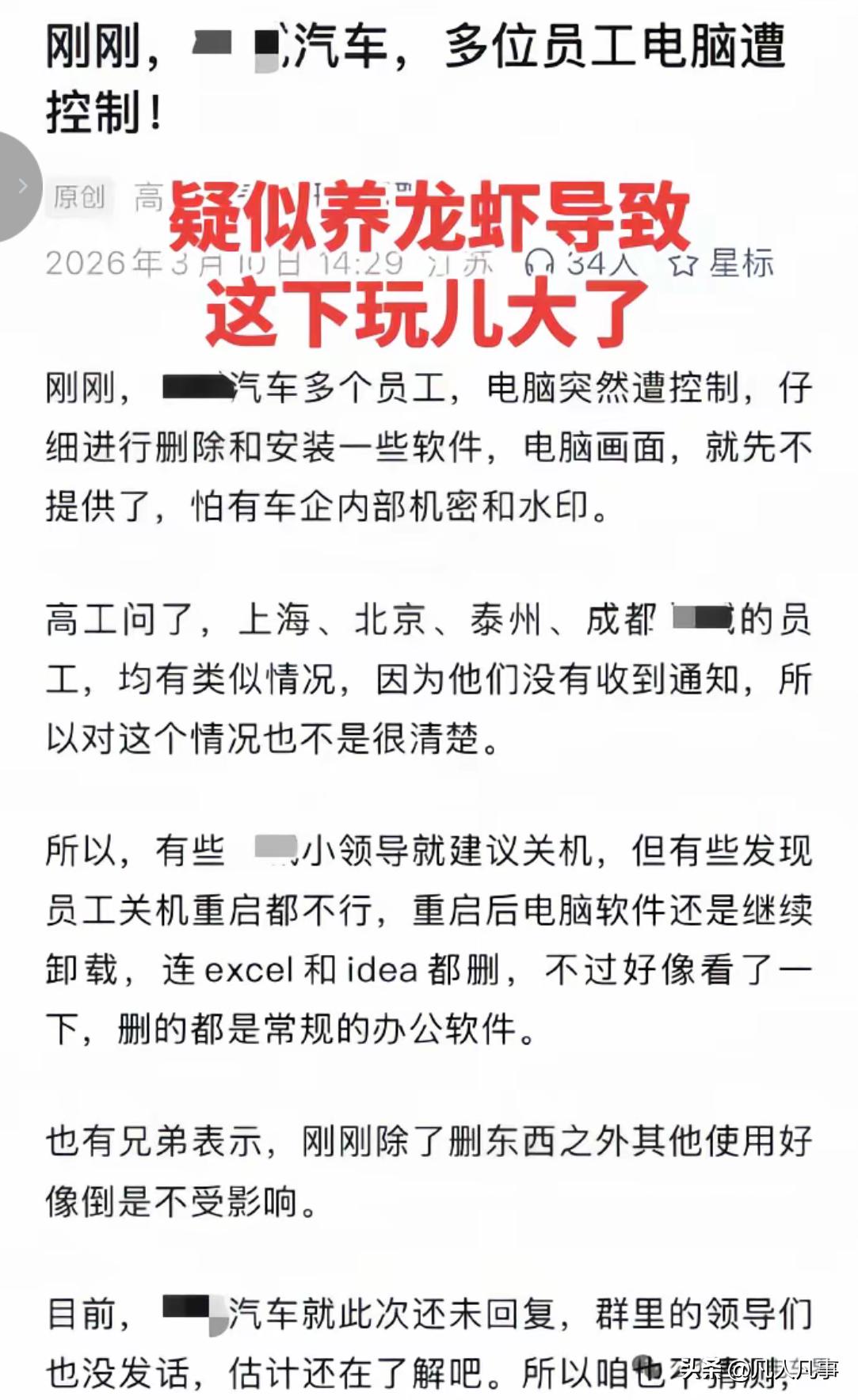 最近大家有没有发现:前些天到处都是推荐安装“小龙虾”的视频,有说是行业风口的,有说帮别人装这个软件就能挣多少钱的,有说到处都在排队安装的;而这几天,有大量网友发系统被“小龙虾”控制后,有电脑密码被悄悄更改的,有炒股造成巨大损失的,有悄悄给别人转钱的,有私人信息被公开发布的…反正问题一大堆!其实早在这个软件出来,被吹得神乎其神的时候,很多人就看出问题:AI始终是AI,把某些工作交给它做,可能会很好的完成。但是把你的财产和关键信息交给它来处理,必定会面临巨大的风险。而集中出现大量宣传其好处的视频,怎么看也是背后有推手在推动这个事情。咋们国人有一点是非常统一的:喜欢闷声发大财!如果真有什么好事,都是悄悄的获取好处,而不是四处嚷嚷,引来别人的关注和竞争。现在那些跟风的人,花了不少钱不但没得好处,反而遭受了不同程度的损失。即便暂时没遇上什么情况的人,也被反复提醒,有信息泄露风险,有财产损失风险。其实大家只有明白一个道理:喊你去赚钱的人,多半是想挣你的钱,不要盲目跟风,不贪不占,你就能避开99%的风险!