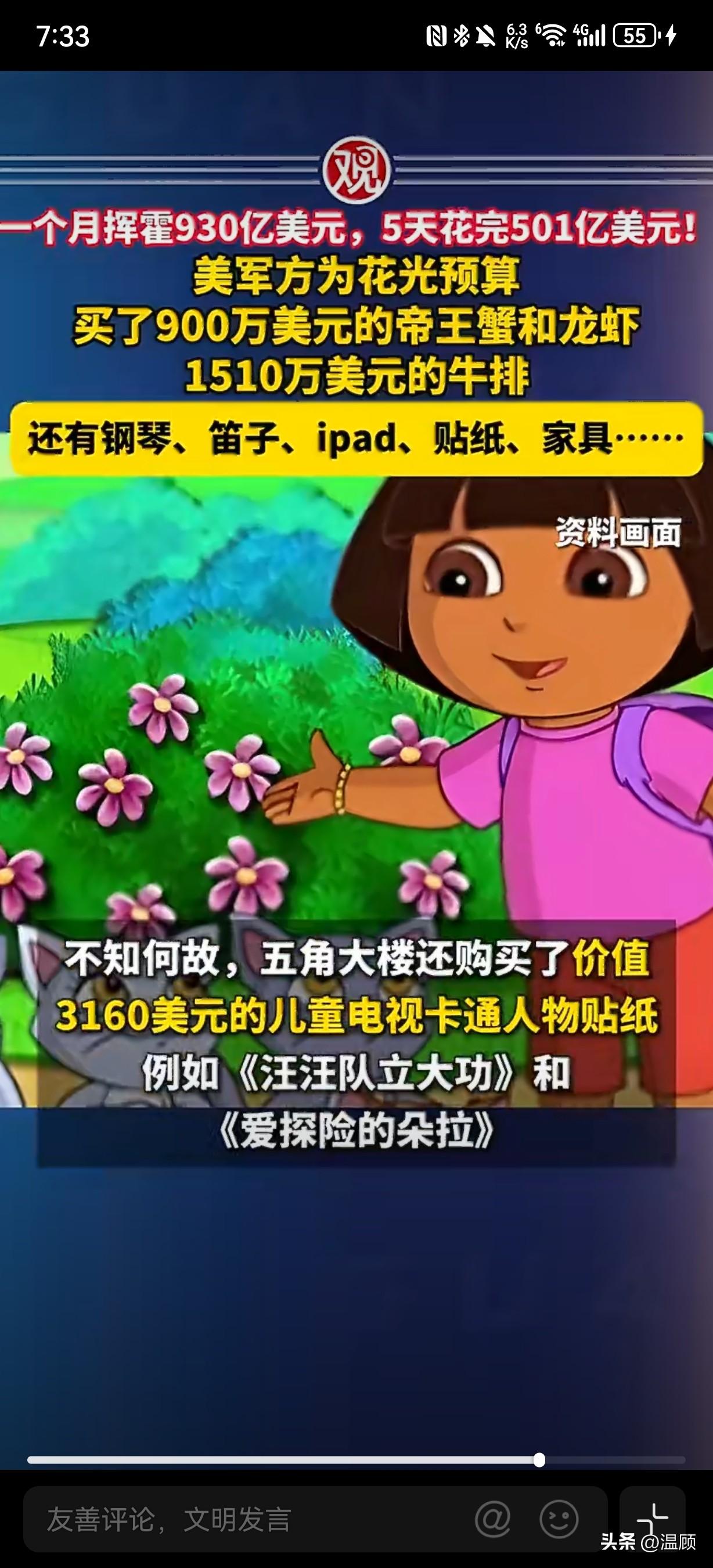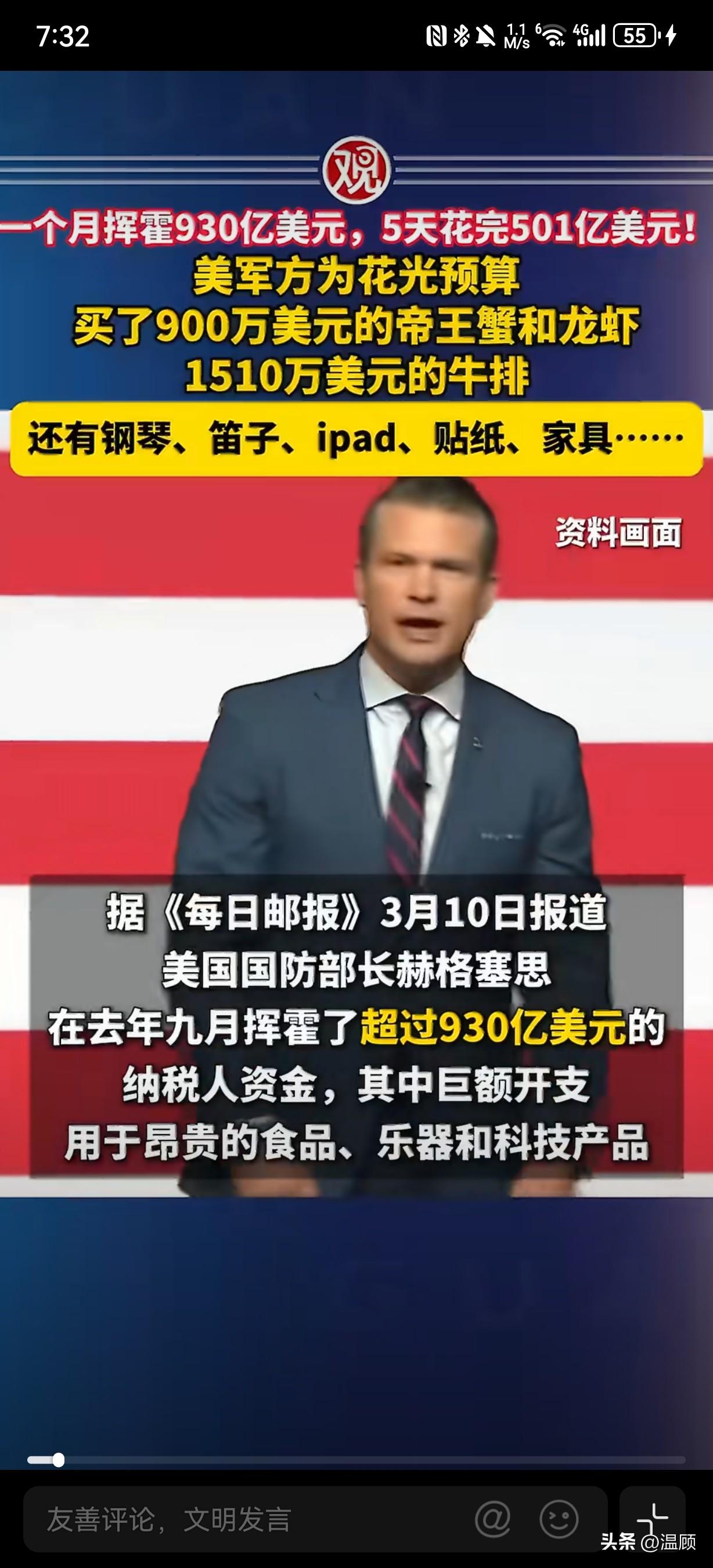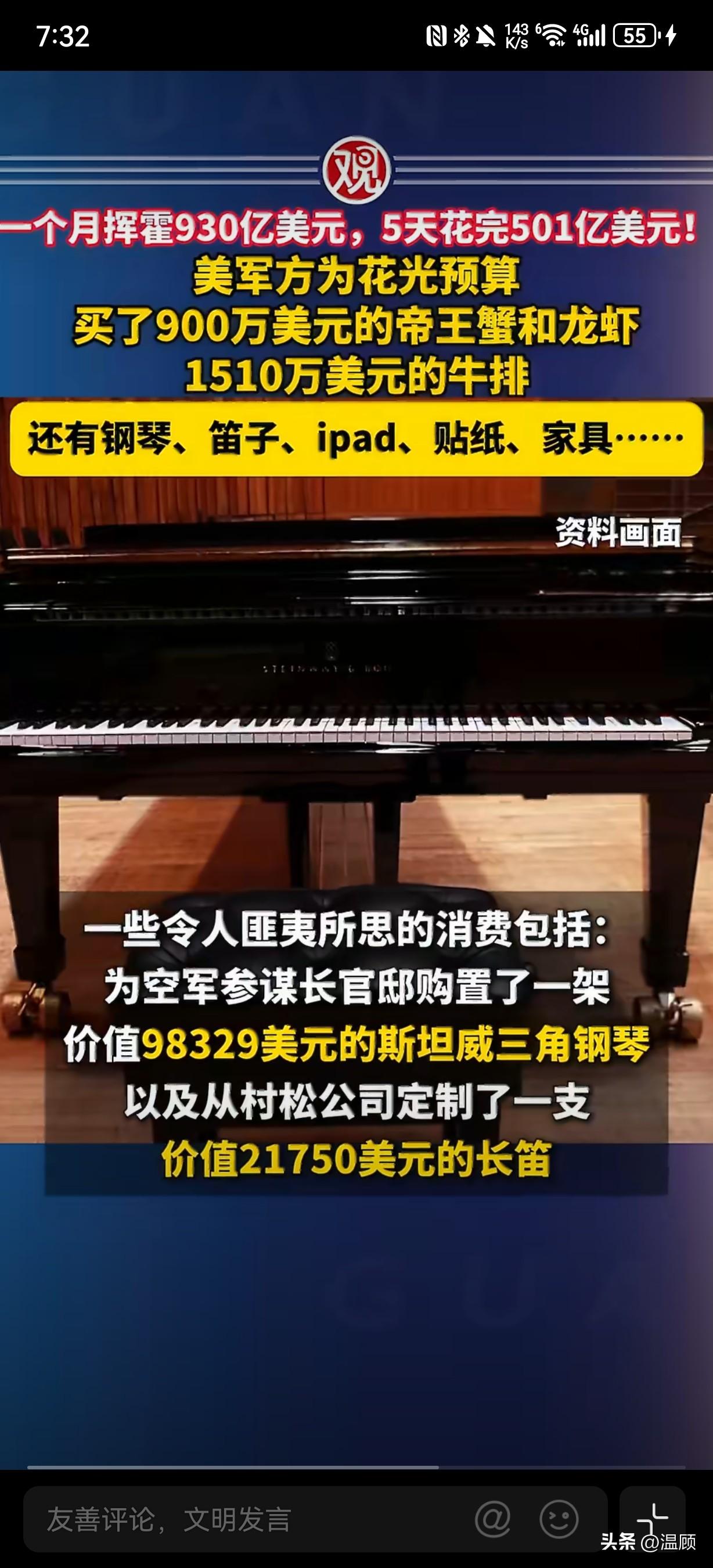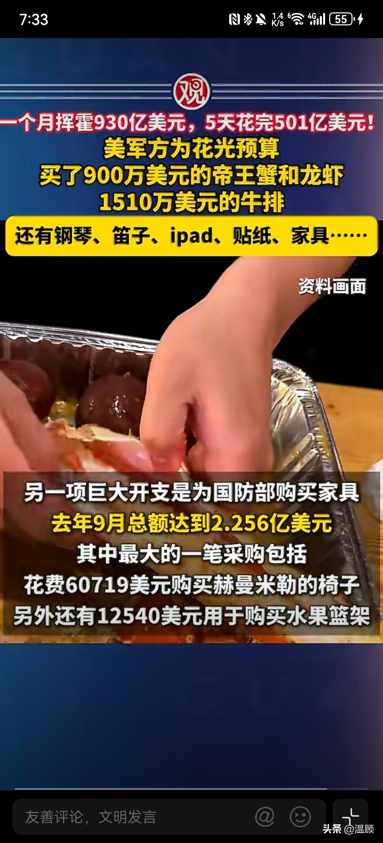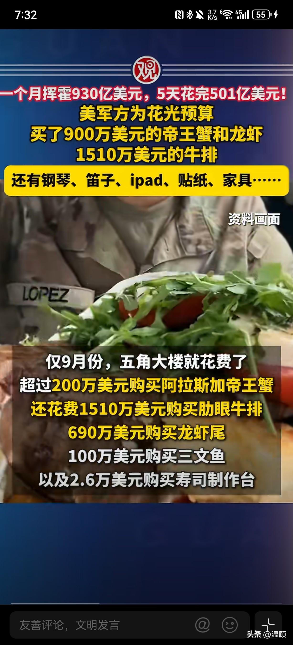 前方吃紧,后方紧吃…美国军方为了不浪费预算,年底彻底放飞自我,上演疯狂突击花钱! 2025年9月(财年末),美军单月花掉934亿美元(近930亿),创2008年以来联邦机构单月支出纪录。最后5个工作日狂砸501亿美元,占当月一半,典型“不用即作废”的预算游戏。 - 天价吃喝(合计≈2400万美元): - 帝王蟹+龙虾:900万美元(200万帝王蟹、690万龙虾尾) - 肋眼牛排:1510万美元 - 甜甜圈:13.9万美元(仅272份)、冰淇淋机12.4万、水果篮1.2万 - 奇葩采购(非作战): - 斯坦威钢琴:9.8万美元(空军参谋长官邸装饰) - 长笛/小提琴:4.77万美元 - iPad/苹果设备:530万美元 - 卡通贴纸:3160美元(朵拉/冰雪奇缘) - 豪华家具:2.256亿美元(单椅1844美元) ………