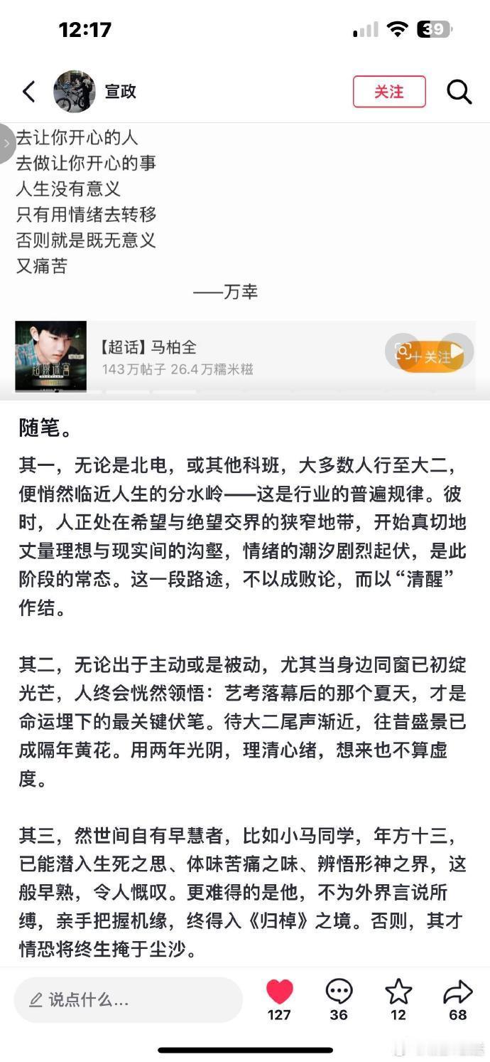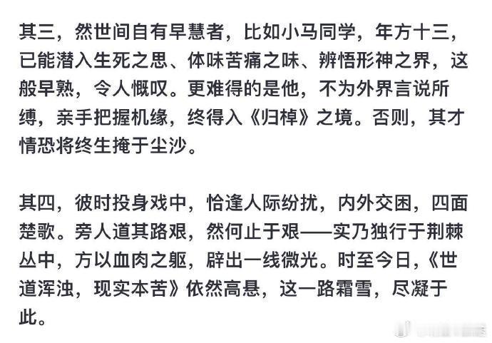 北电老师对马柏全的评价 北电老师这番话写得太有分量了:“然世间自有早慧者,比如小马同学,年方十三,已能潜入生死之思、体味苦痛之味、辨悟形神之界,这般早熟,令人慨叹。更难得的是他,不为外界言说所缚,亲手把握机缘,终得入《归棹》之境。否则,其才情恐将终生掩于尘沙。”