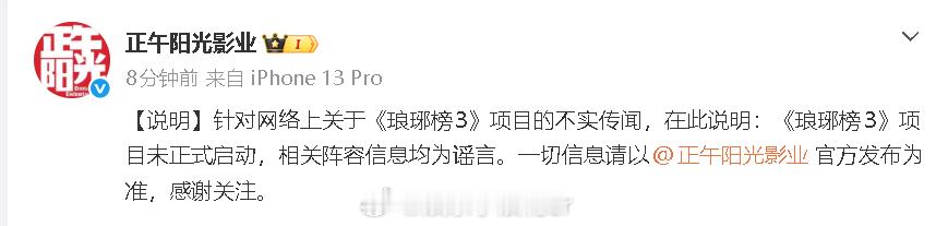 正午阳光辟谣琅琊榜3阵容信息正午阳光称琅琊榜3未正式启动