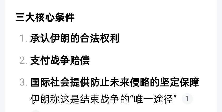 伊朗佩泽希齐扬哪里像个交战国的负责人,怎么看他就是加沙哈马斯的负责人,他的那几条谈判条件,如果不是第二条要美以赔偿,美以下不了台,其他任何两条,妥妥的卖国条款嘛! 第一条就纯纯搞笑,你国家权利需要别人口头承认,美以是有信誉的国家吗? 第三条那是加沙人民和巴勒斯坦人天天放嘴上几十年的口头禅,这个伊朗总统脑袋不会是长屁股上了吧!